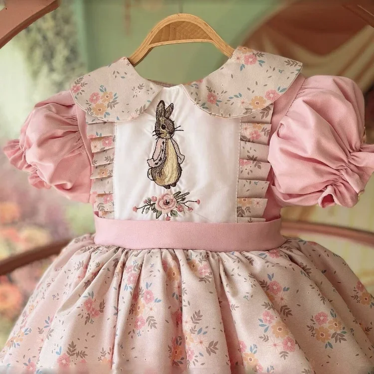 0-12Y Girl Summer Rabbit Embroidery Floral Turkish Vintage Princess Pink Dress for Easter Eid Birthday Photography B178