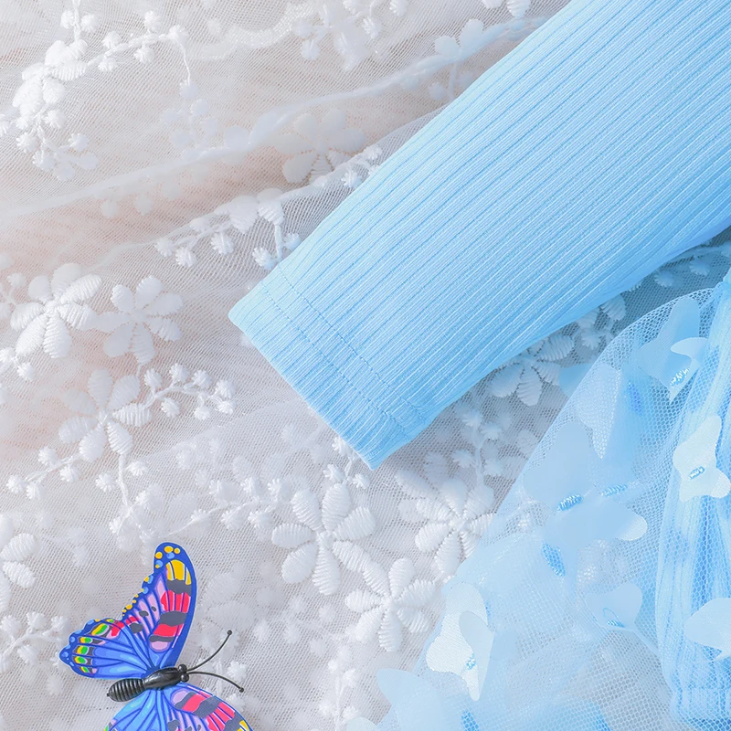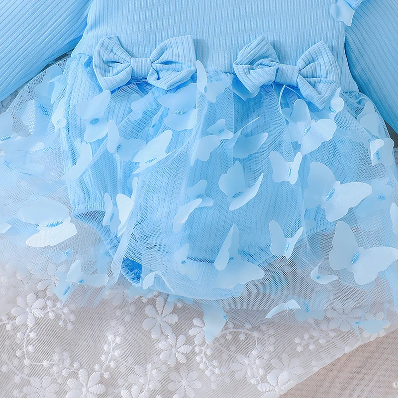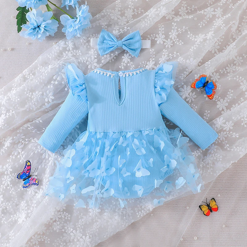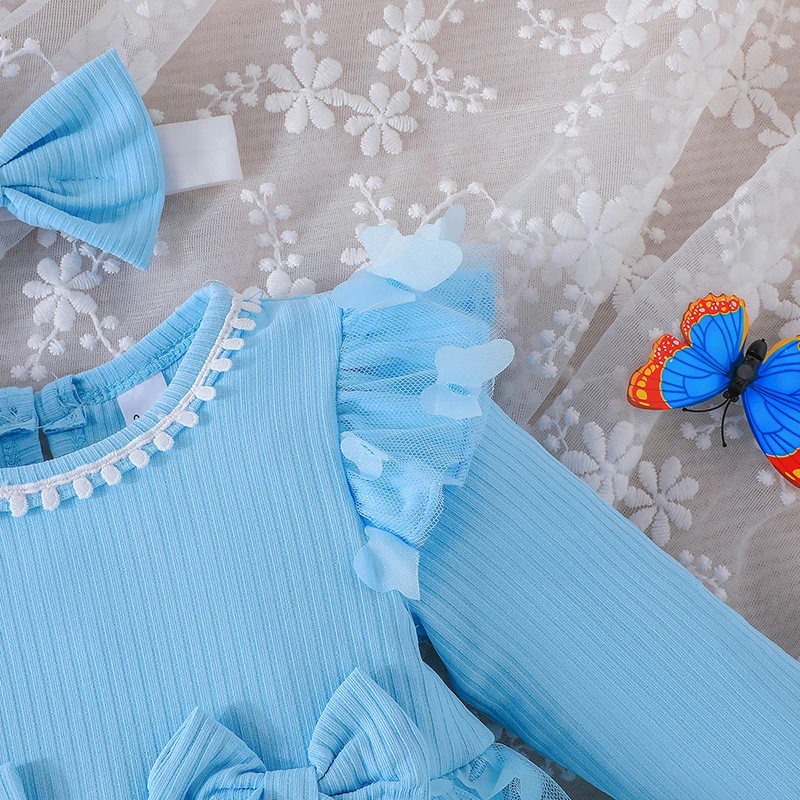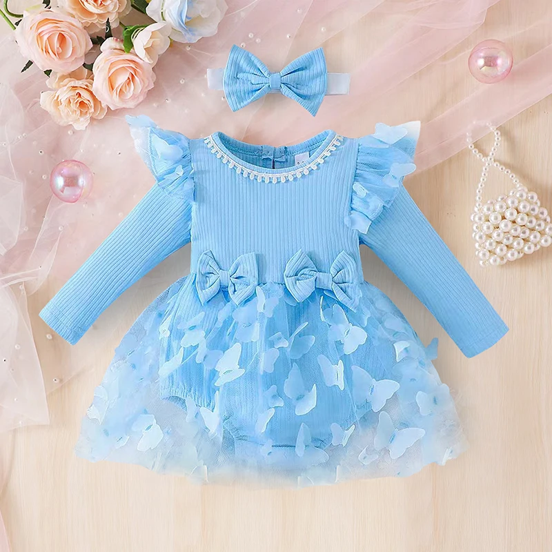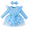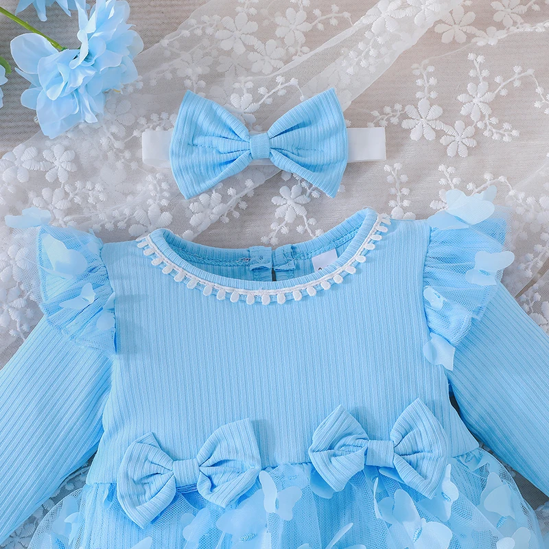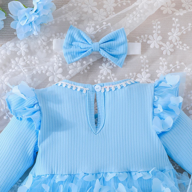 0-18M Baby Dress With Headband Long Sleeve Blue Flower Dress Infant Party Dresses Bow Floral Mesh for Newborn Birthday Party
