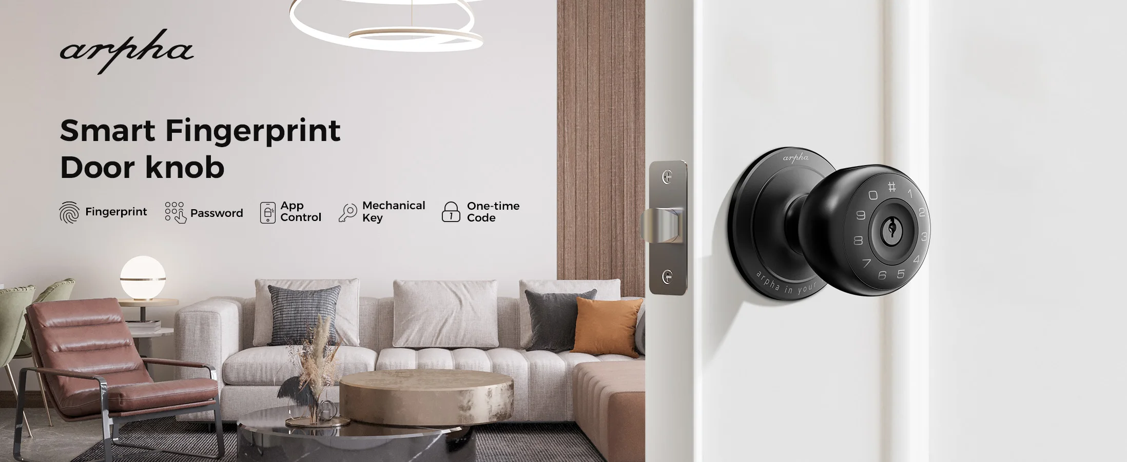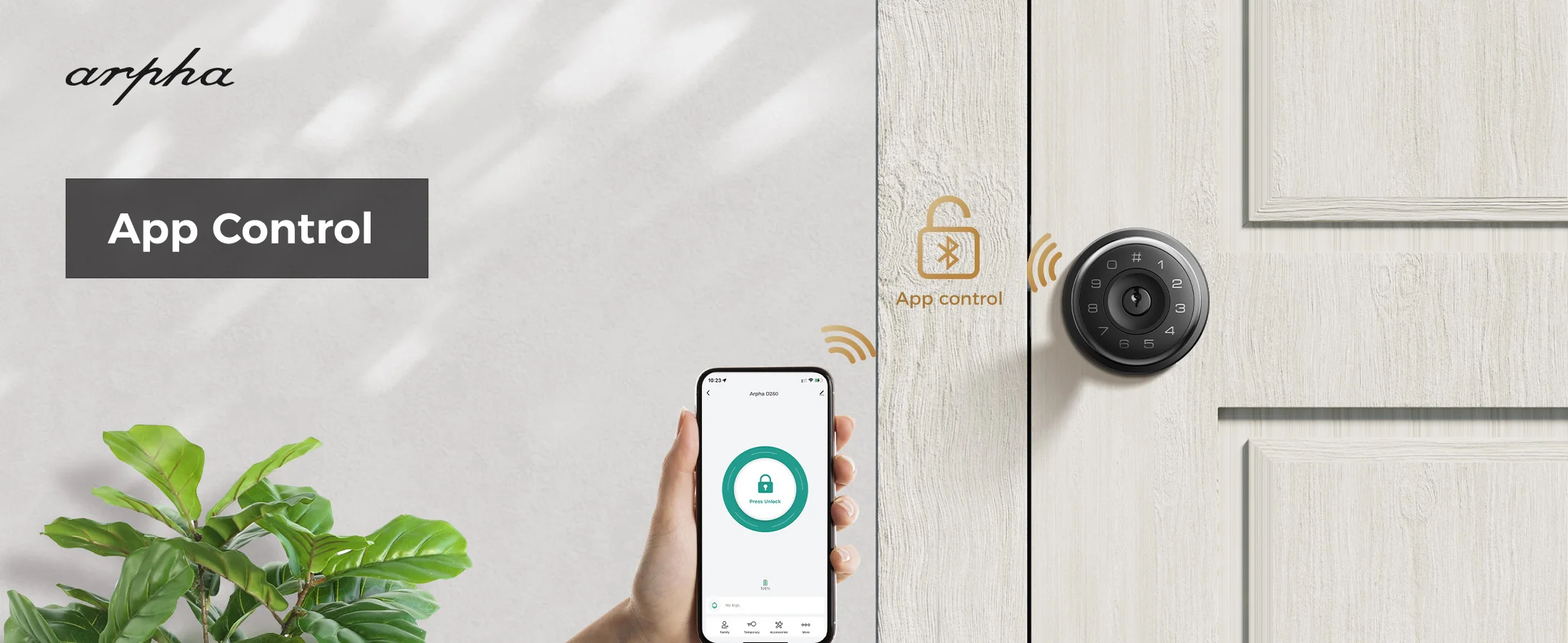 Arpha D260 fingerprint door lock provides 5 unlocking methods, including APP control, fingerprint unlocking, password, spare key, one time code unlocking. 50 fingerprints + 50 passwords—perfect for multi-person homes, with 6-10 digit flexible passwords.