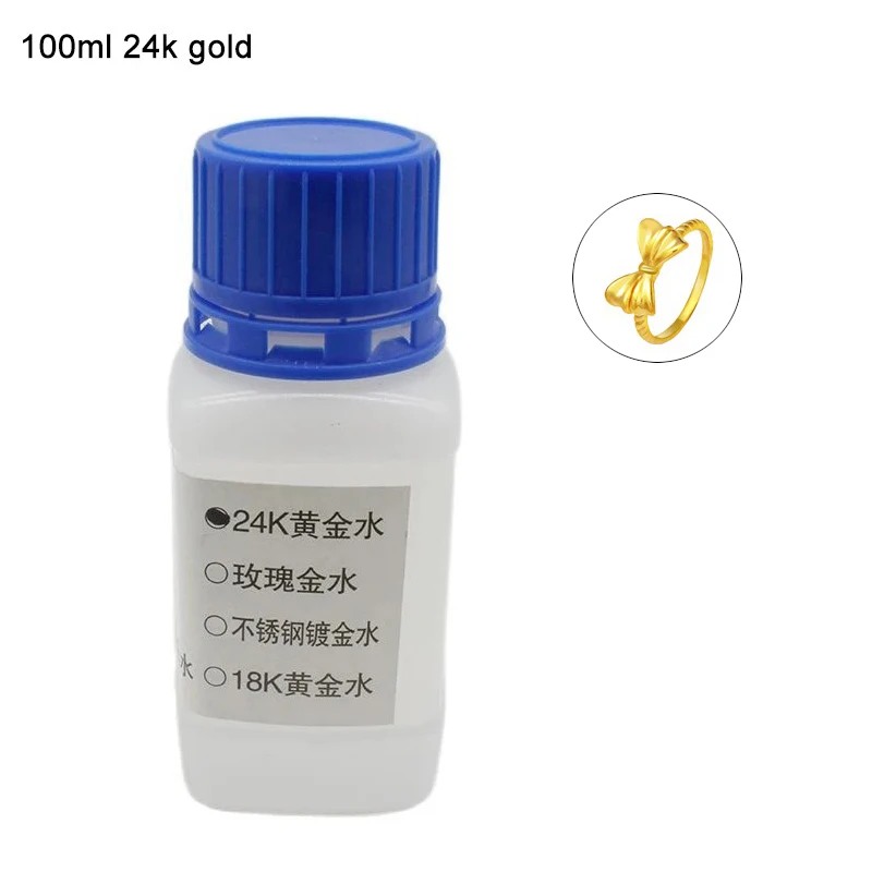 Function:24K gold electroplating water, need to be used together with electroplating machine + titanium mesh, can be used after stainless steel base another layer of 24K yellow is plated, and the color is bright.