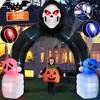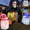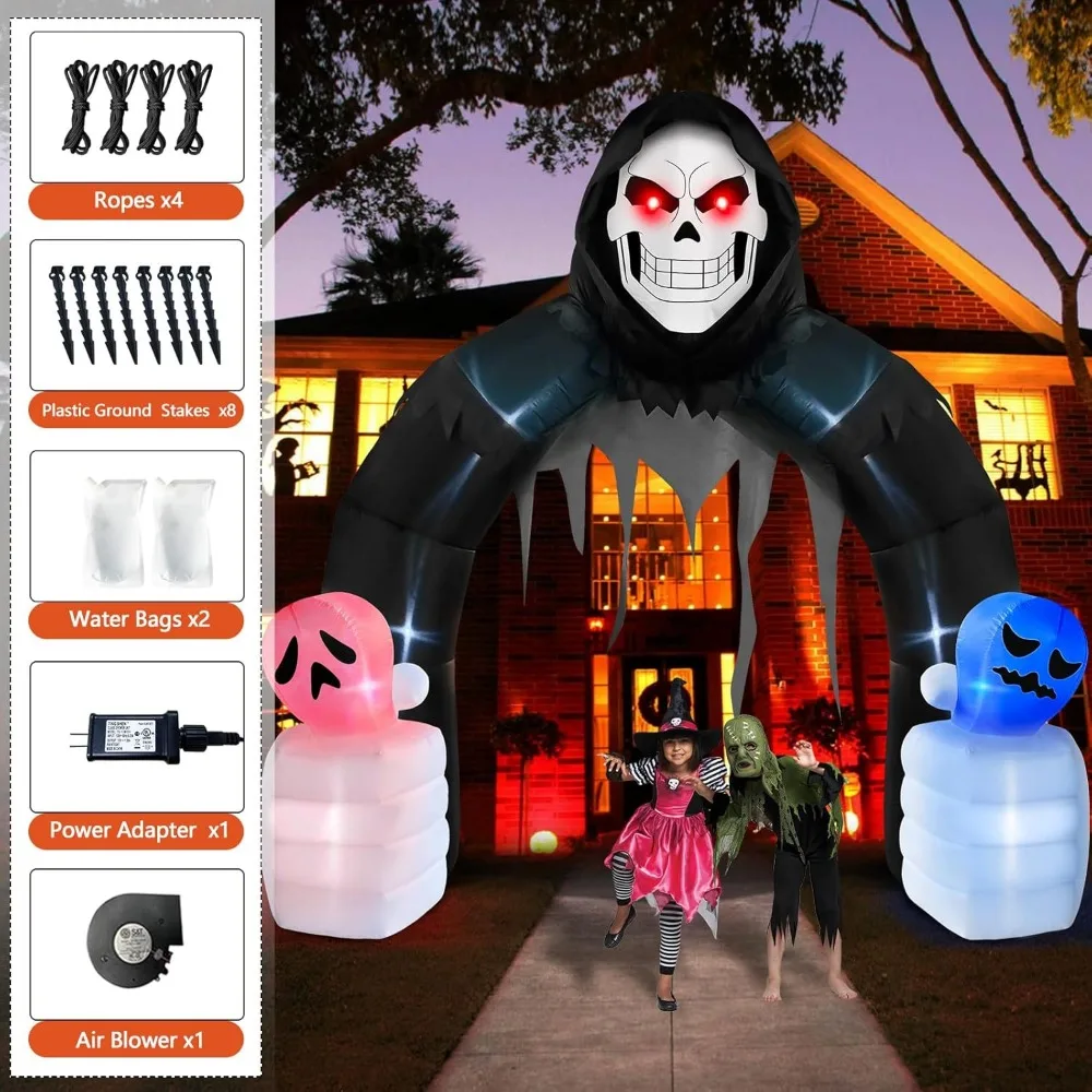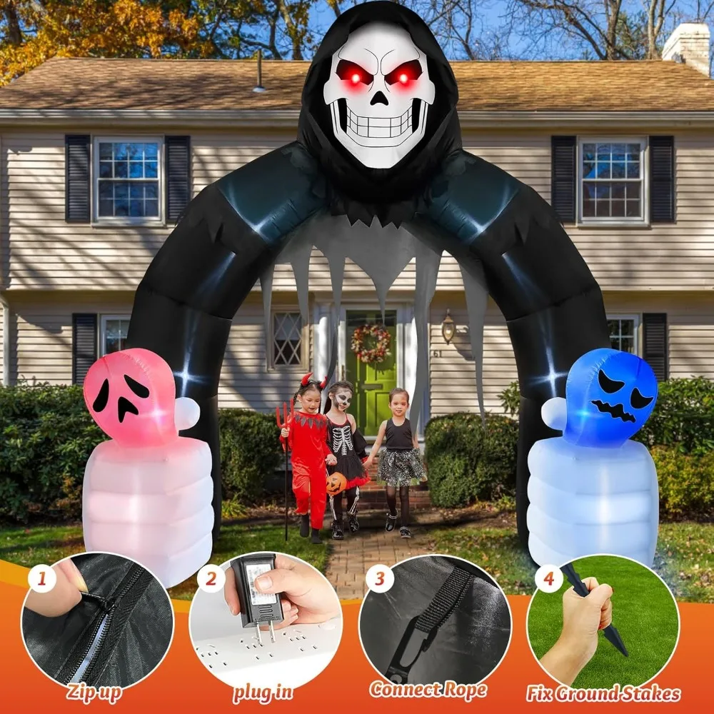 - 💀【Eerie Reaper Archway】Welcome your guests to a horror world with our 10-foot halloween grim reaper inflatable archway, a scarry addition to your Halloween decor. The Grim Reaper’s ominous presence, with glowing red eyes that seem to watch your every move, and grabbing two ghosts in both hands, sets the stage for a bone-chilling experience. Creates an unforgettable Halloween Day with this scary inflatable arch decoration!