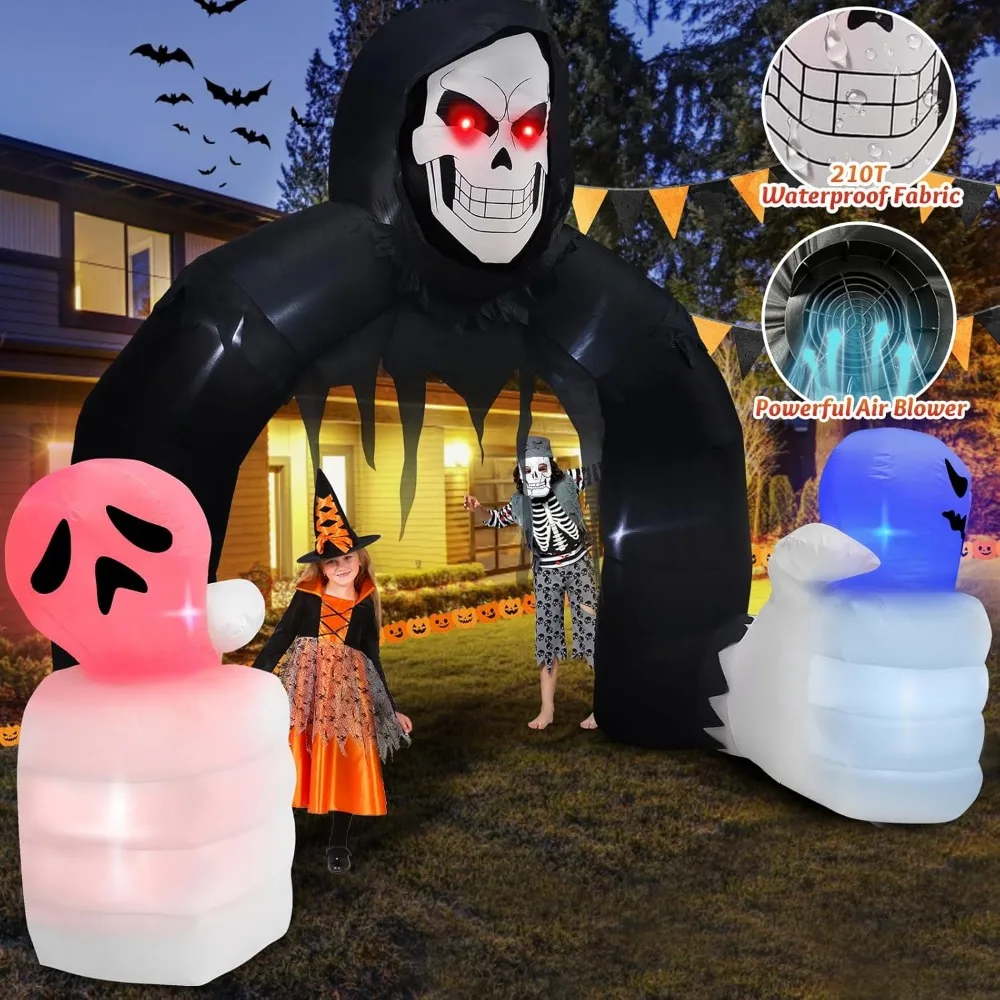 - 🎃【Spooktacular Dual-Light Night】Prepare to be mesmerized by the red and blue LED lights effect emitted by the Grim Reaper’s hands. The halloween inflatable arch itself is shaped like the foreboding figure of Death, creating a macabre entrance to your haunted domain. As guests pass under the reaper’s arch, they’ll feel a shiver down their spine, immersing them in the eerie spirit of Halloween. Perfect for Halloween parties, or decorate your yard, lawn, garden, front porch.
