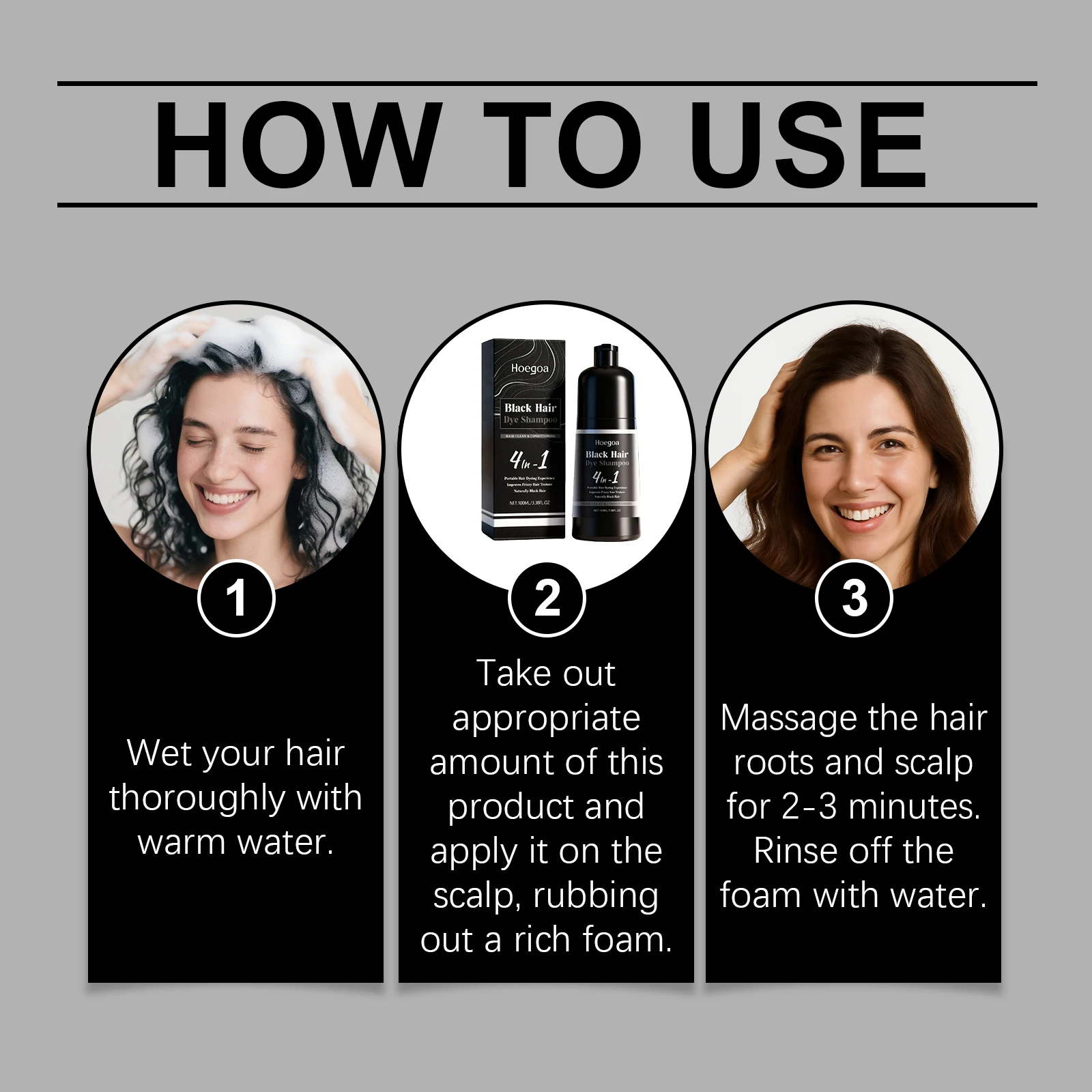 2. Take out appropriate amount of this product and apply it on the scalp, rubbing out a rich foam.