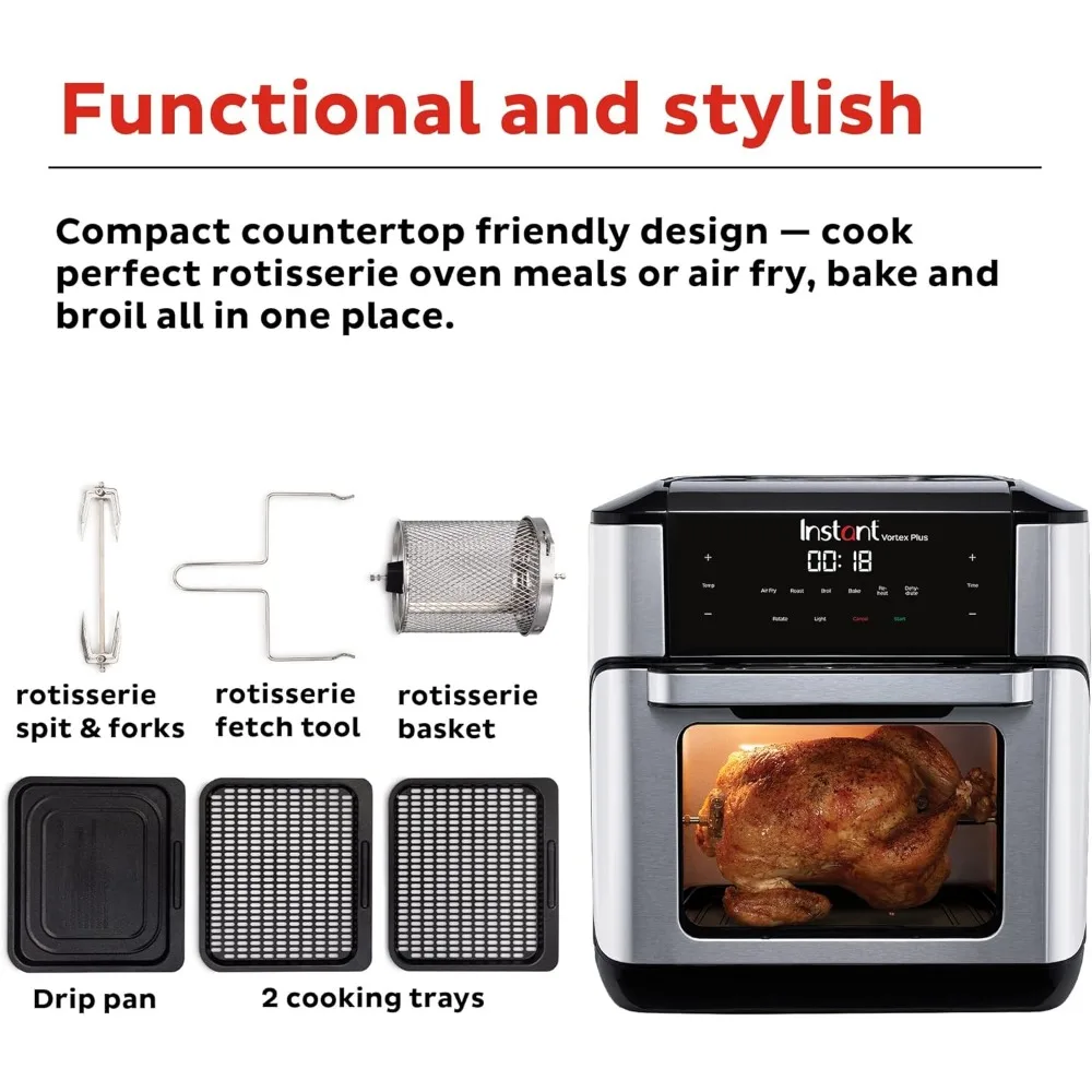 • INCLUDED ACCESSORIES: Include a non-stick drip pan and 2 perforated cooking trays, as well as stainless-steel rotisserie basket, rotisserie spit and forks, and lift tool.