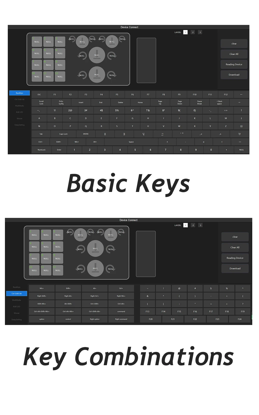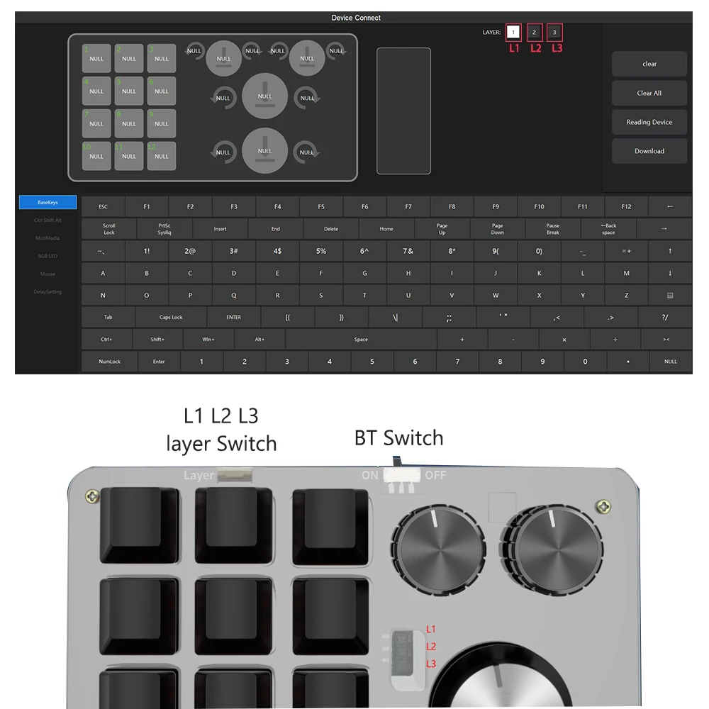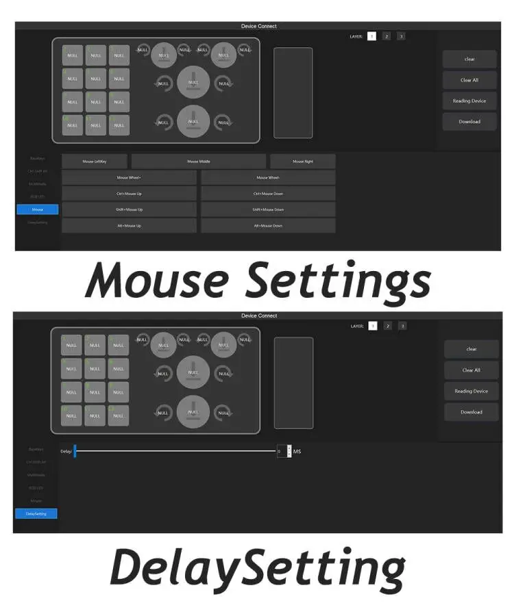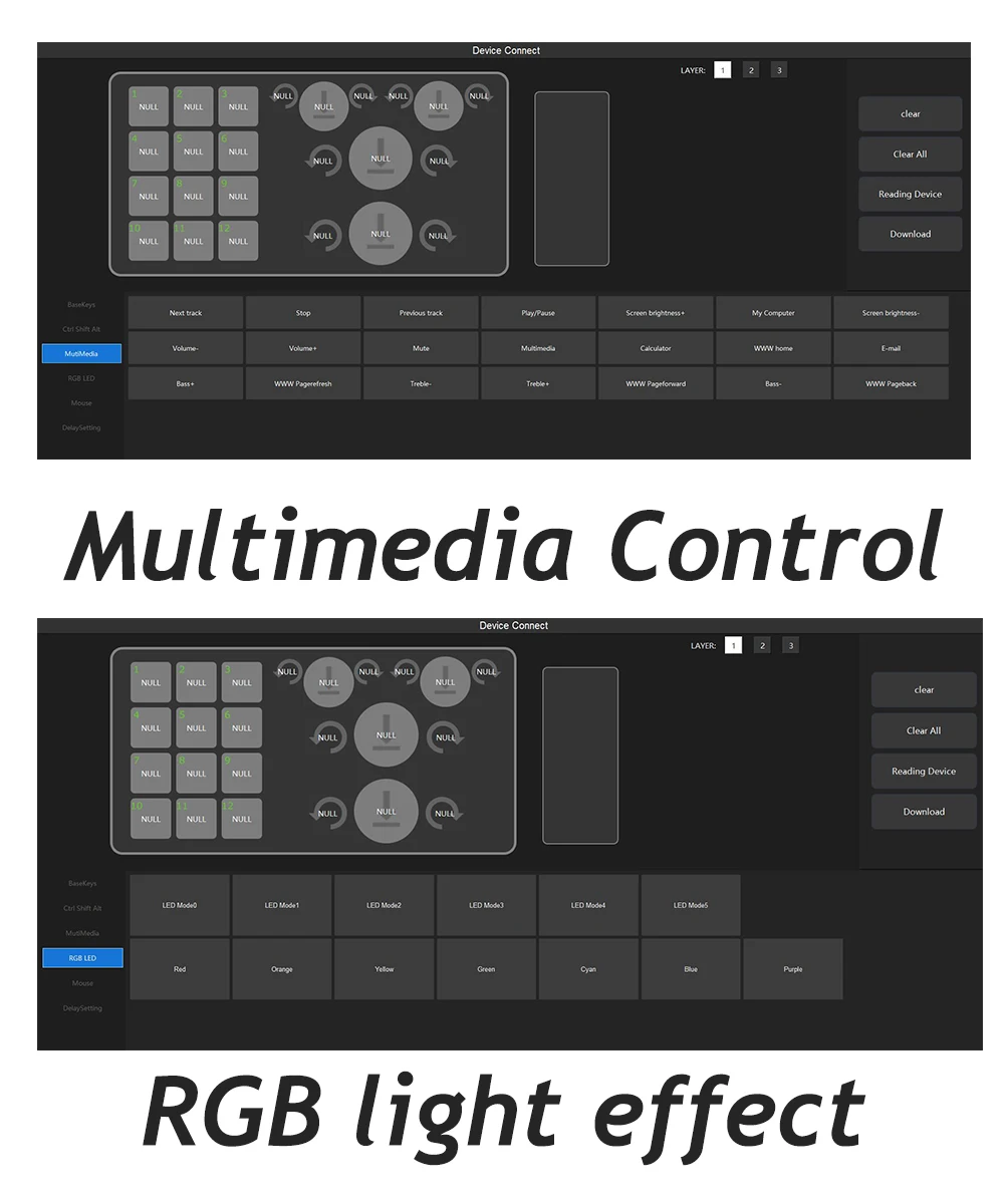 💦 Drive free use. You don’t need to install a driver to use it. Hardware macro functions: support regular key values, combination keys, mouse keys, delay, etc. on standard keyboards. On board storage: The configuration is stored inside the keyboard for replacement, and the computer is not lost. No need to reset.