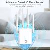 3.【High Performance】: Support wifi signal extending through the wall; the extending distance can be up to 100ft,no more dead zones in your smart home life(speaker / monitoring / TV / doorbell / thermostat).2 External antennas for better performance, reliable wireless N network speed up to 300Mbps covering your bedroom, floors, restroom, garage and garden.