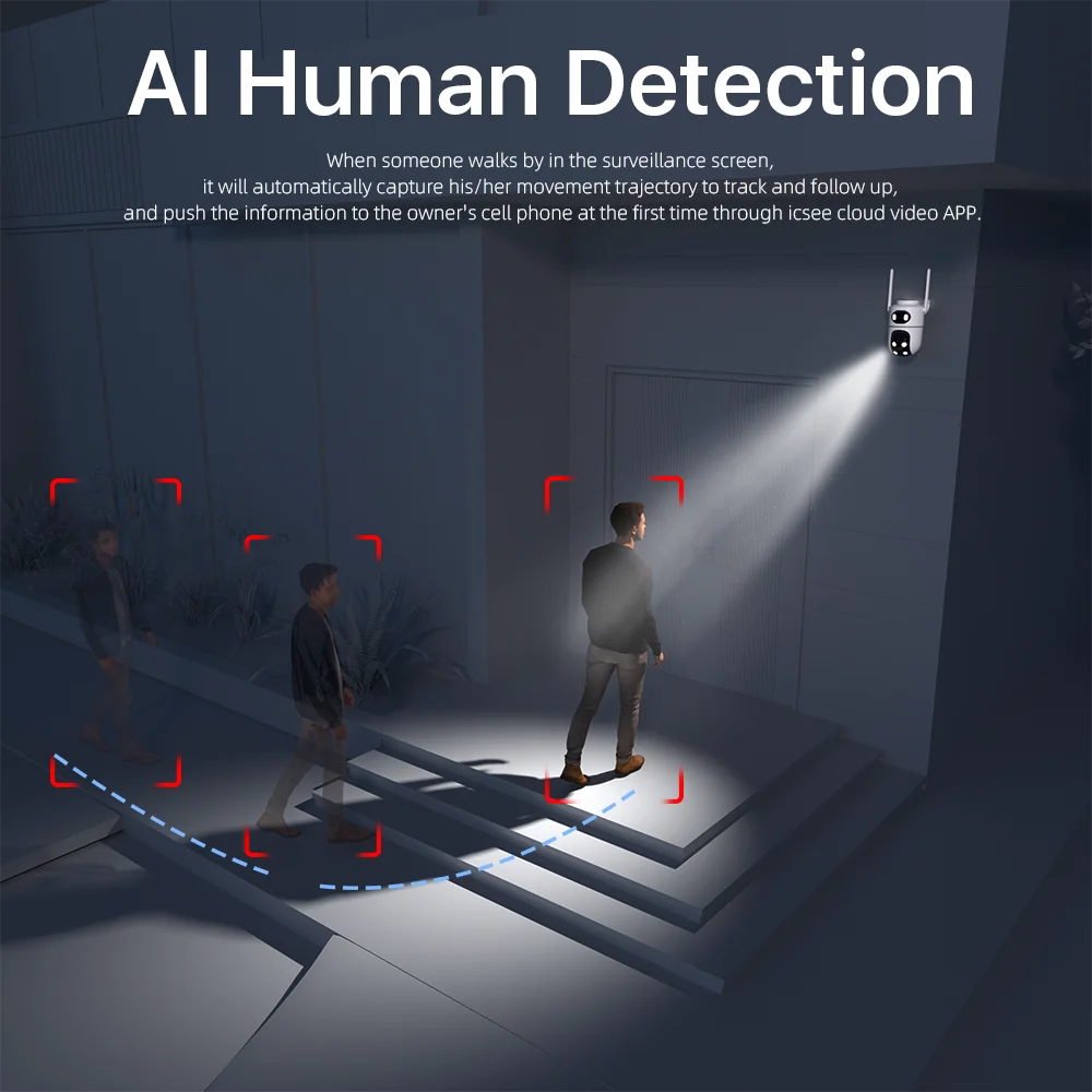 After locking the target, the camera will adjust the pan rotation automatically, Tracking Moving Human and push alerts notifications to your Smartphone.
