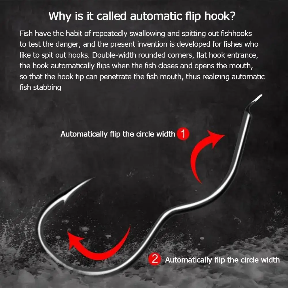 Fish have the habit of repeatedly swallowing and spitting out fishhooks to test the danger, and the present invention is developed for fishes who like to spit out hooks. Double-width rounded corners, flat hook entrance, the hook automatically flips when the fish closes and opens the mouth, so that the hook tip can penetrate the fish mouth, thus realizing automatic fish stabbing