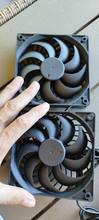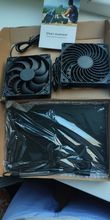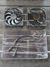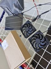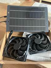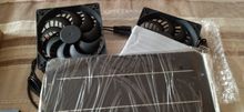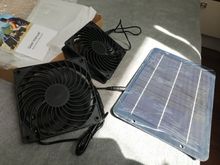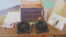 Very slim PV panel, two big fans. Tested in the sun, runs perfectly. Don't know the full speed of the fans but it is sufficient with the power provided by the solar panel.