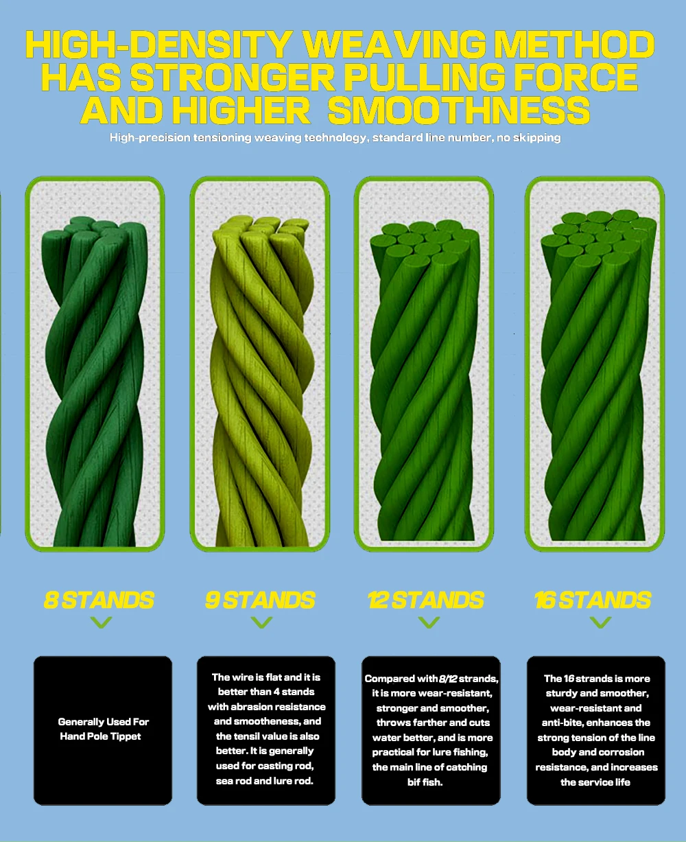 The NEW 16 Strands Braided Fishing Line is the perfect choice for avid anglers. This high-strength, anti-bite, and wear-resistant fishing line is designed using the latest weaving technology to ensure maximum durability and toughness. With a higher density and stronger pulling force, this line provides better performance than traditional 4, 8, 9, and 12 strands lines.