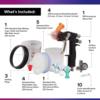 - ALL-INCLUSIVE PAINT SPRAY KIT – Includes 1 Accuspray spray gun, 4 nozzles (1.2 mm, 1.3 mm, 1.4 mm, 1.8 mm), 1 plastic paint cup, 1 collar, 5 disposable lids (4 with 200-micron filter, 1 with 125-micron filter), 5 disposable liners, universal mix ratio insert and sealing plugs. Air compressor and hose coupler not included