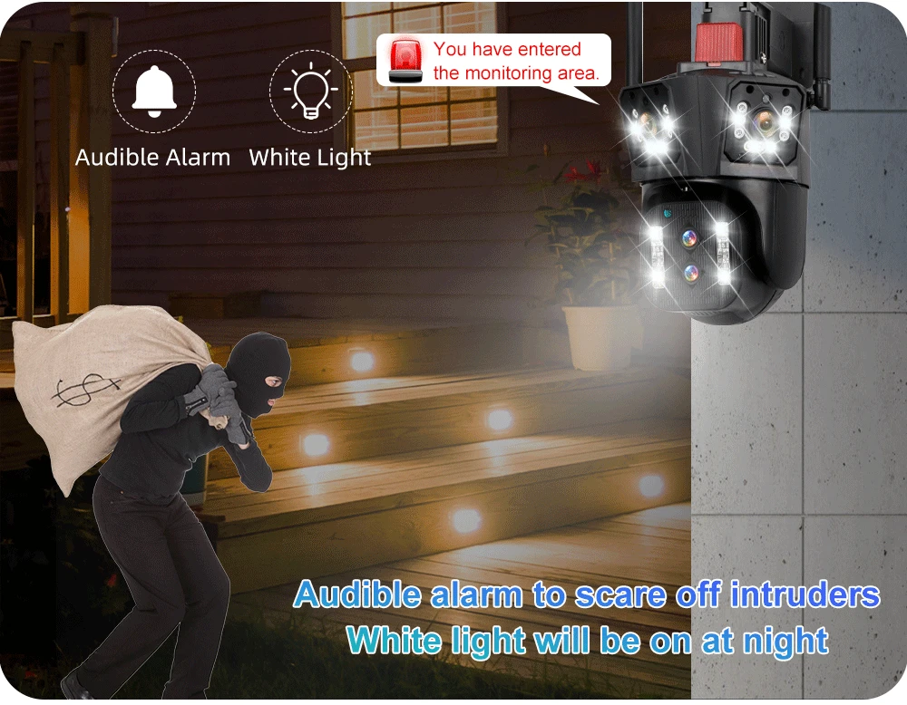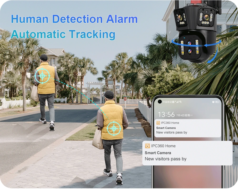 * When human movement is detected, the camera will track the movement of the human body, emit lights, and send real-time alarms.