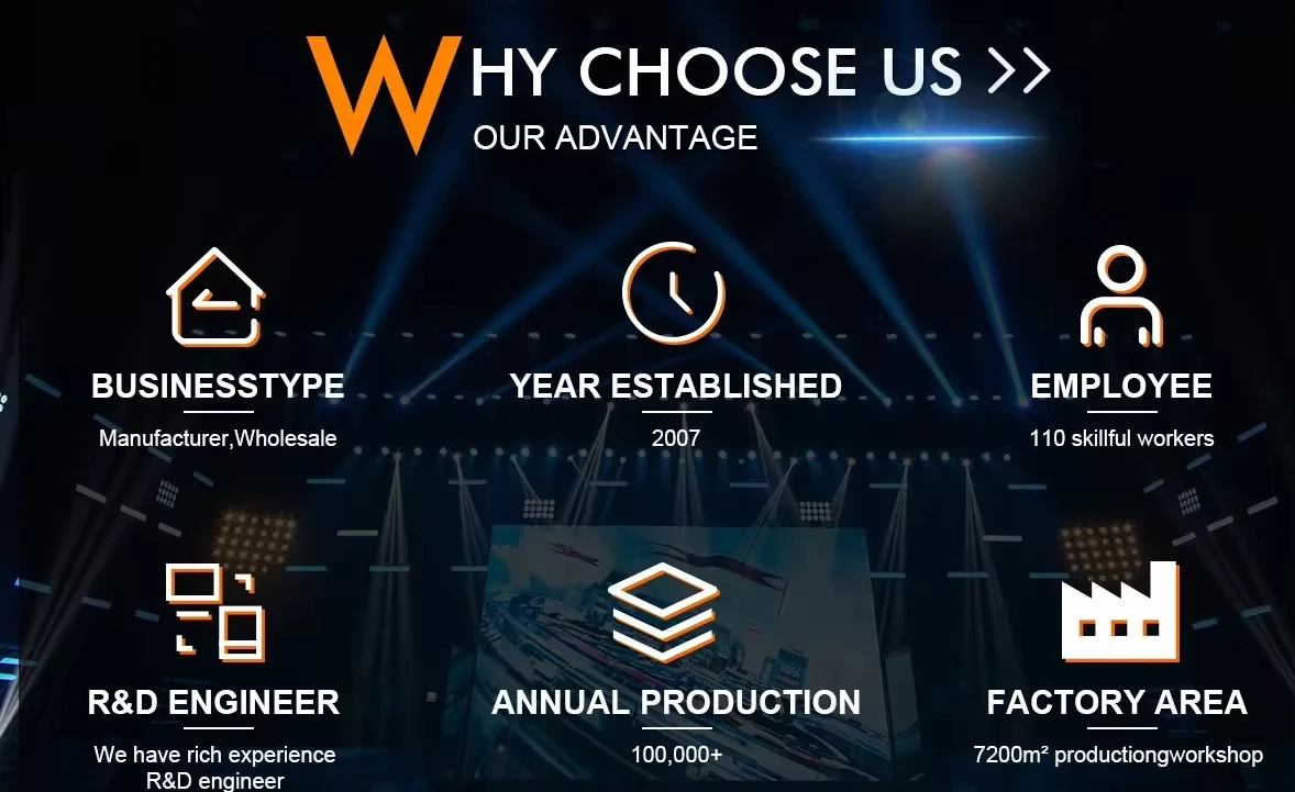 At present, We have the world’s leading stage equipment: beam light, led moving headlight, led par light, battery light, stage effect light, outdoor light, etc. it has a strong and technicalteam to support OEM and ODM manufacturing.