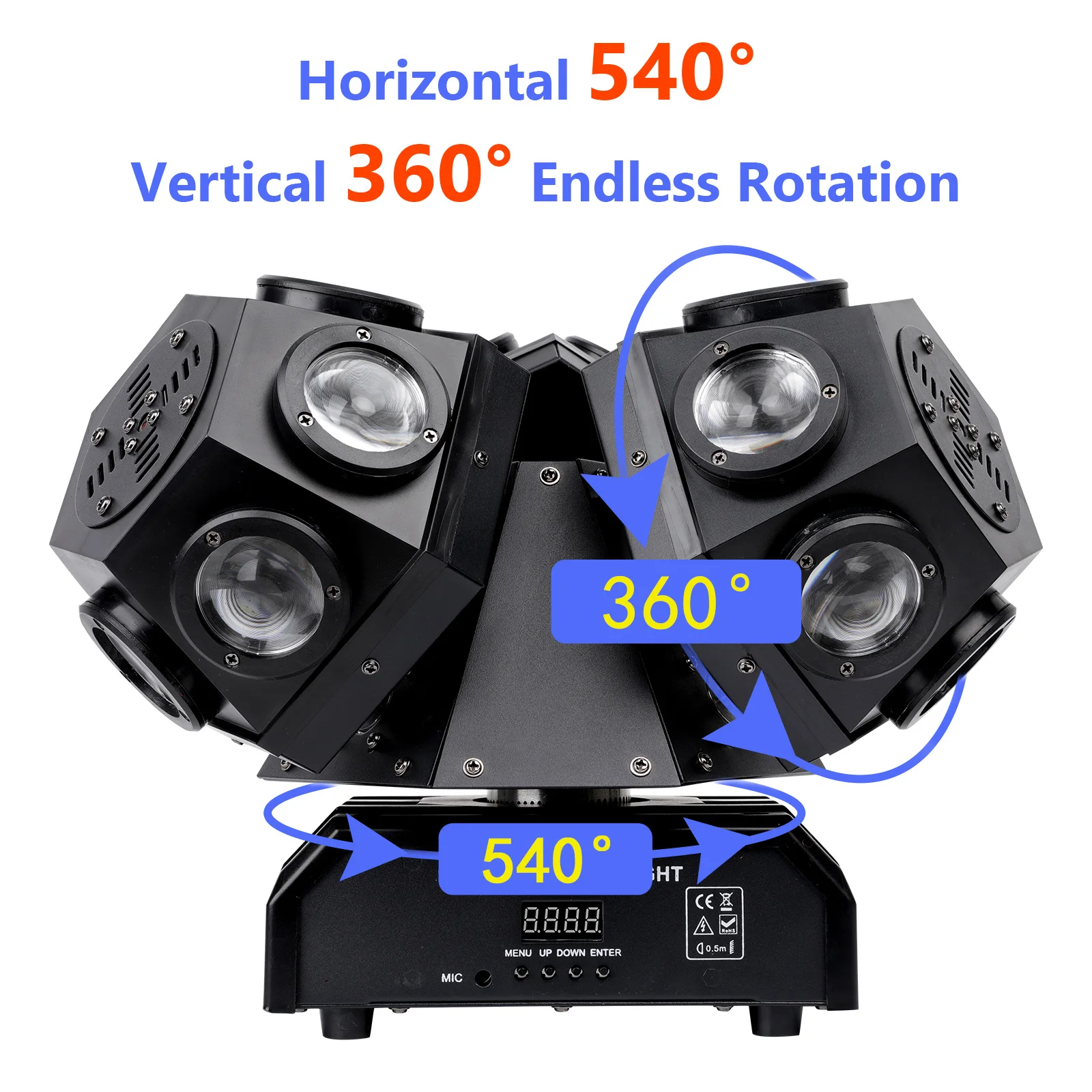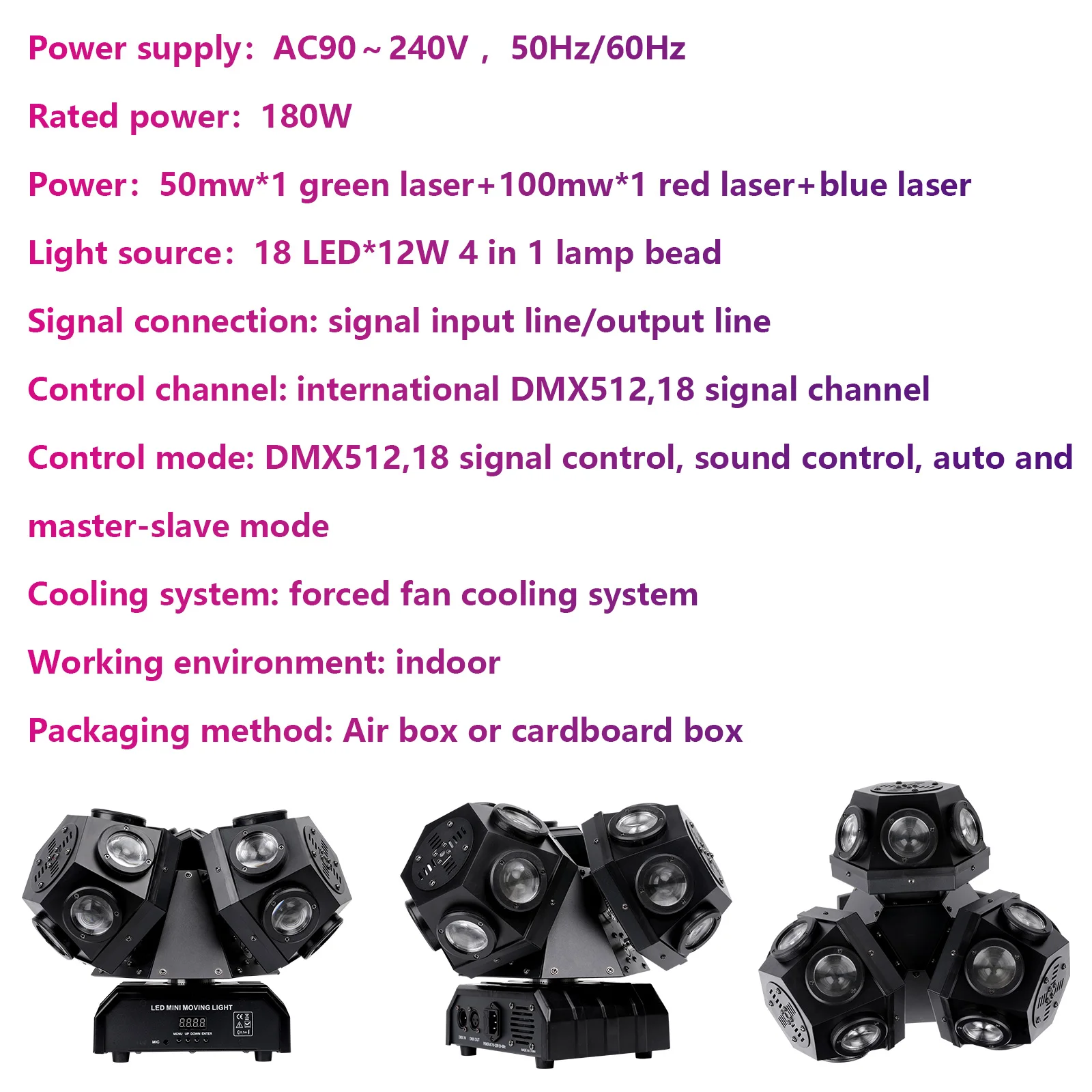 Control mode: DMX512,18 signal control, sound control, auto and master-slave mode