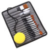 18pcs paint brush kit comes with 12 types of paint brushes, 1 scraper, 1 yellow sponge ball, 1 2B pencil, 1 Watercolor brush pen, and a canvas storage bag.