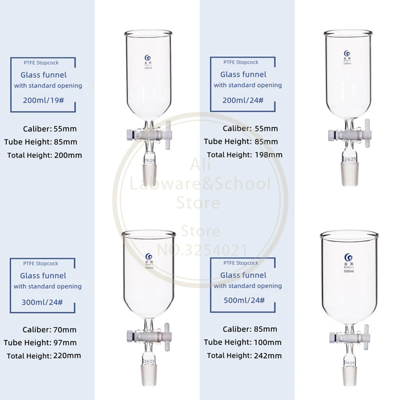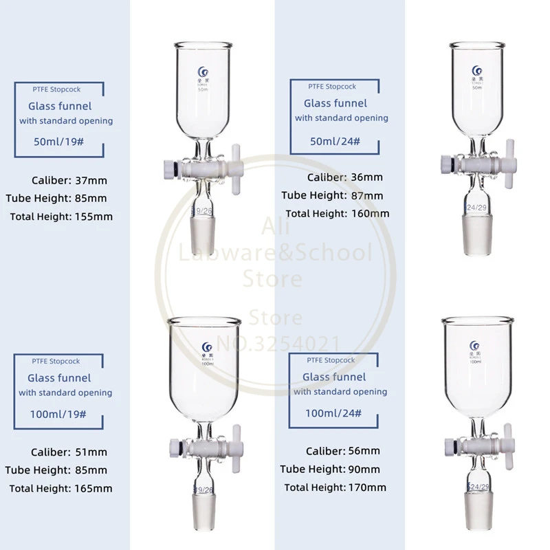 1Pcs Clear 50ml to 1000ml Glass Cylindrical Feed Funnel with PTFE Piston 19#24# frosted Standard joint for lab teaching tools