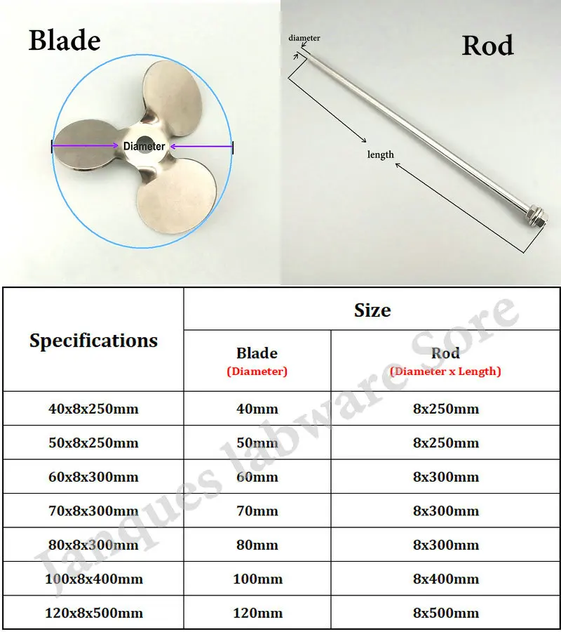 40/50mm three-leaf blade: with the size of the stirring rod is 8X250mm.