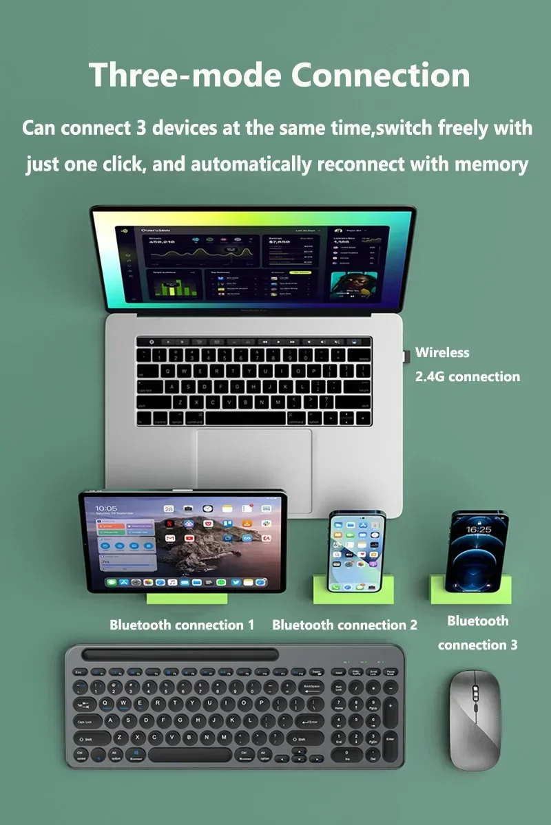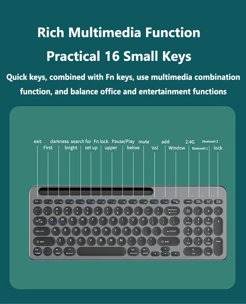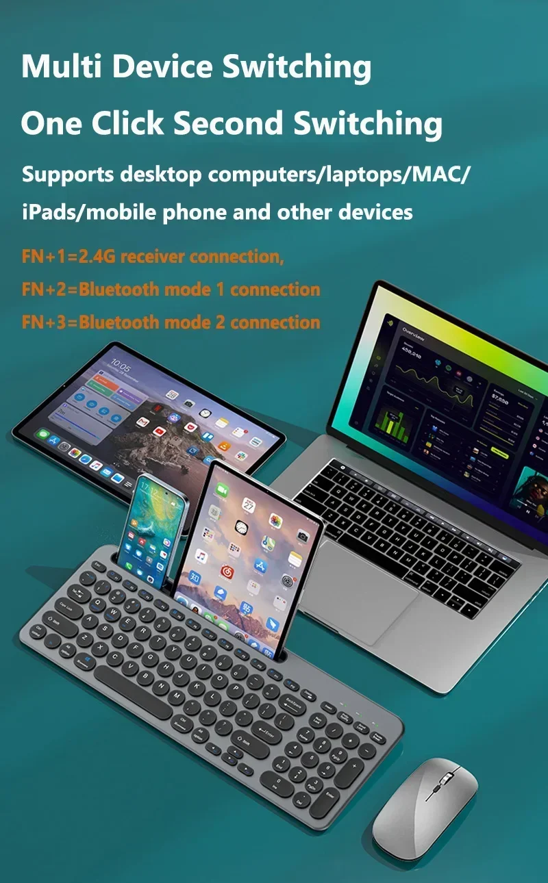 * FN+1=2.4G receiver link, FN+2=Bluetooth mode 1 connection, FN+3=Bluetooth mode 2 connection.