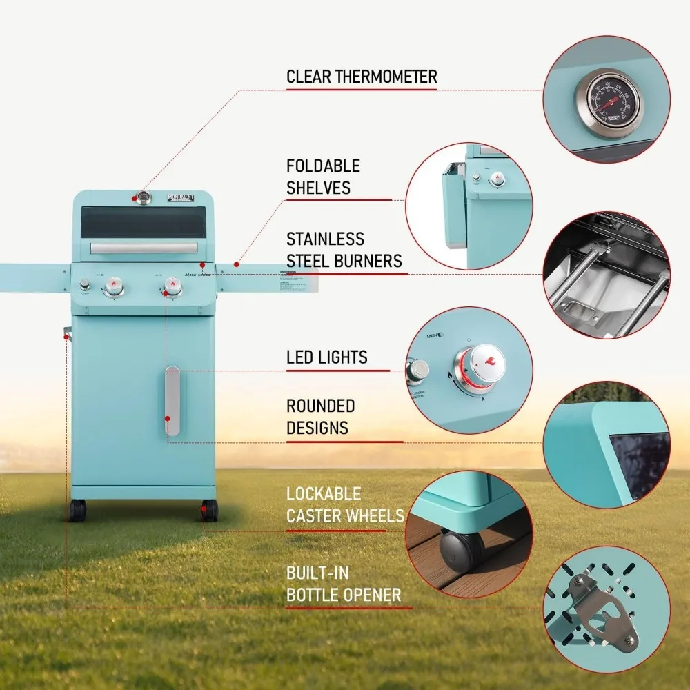 - STAINLESS STEEL BURNERS: Two primary 304 stainless steel burners generate 24,000 BTU for robust heat and performance.