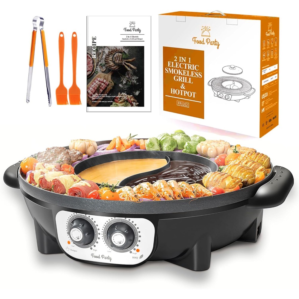 🎉Easy to entertain 1-8 people.The hotpot holds 2L (qt) of liquid. The width of the grill surface is 3.5” (9cm). Hotpot and grill function together or individually with independent temperature control.
