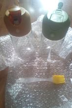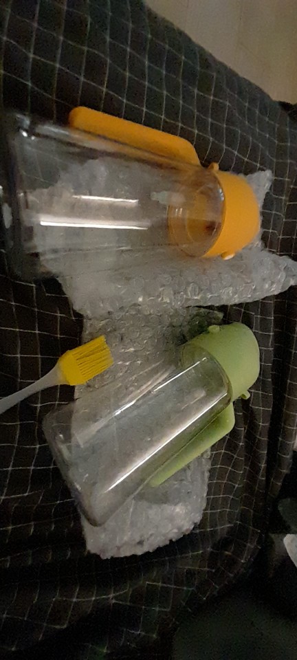 Comes wrapped in two plastic bags being bubbles, they have arrived without any damage. Complies with the description given by the seller, each bottle has the option of spraying by pressing the lever, or of jet opening the lid by means of a button. Also includes a silicone brush. If you are thinking of acquiring it, do not hesitate, I recommend it.