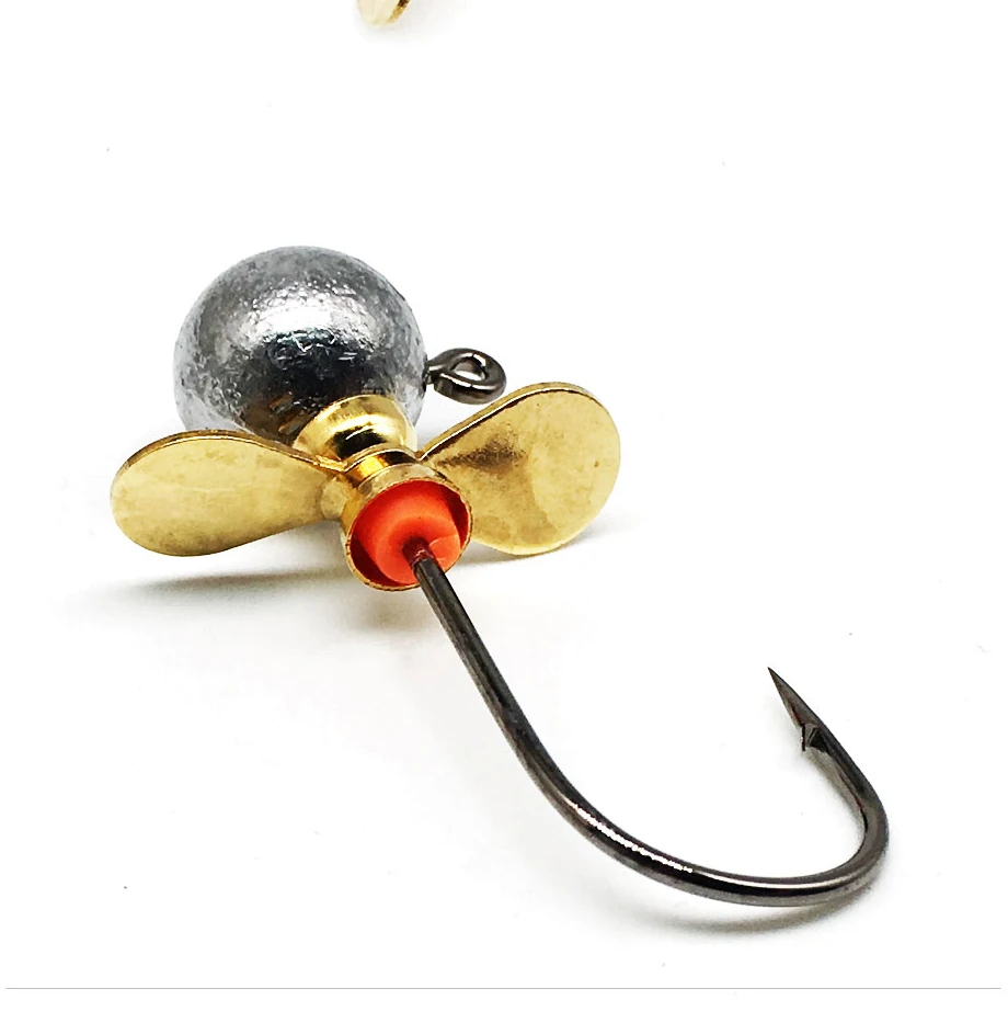 Innovative propeller spinner blade flashes and creates a sonic vibration as it rips through the water to coax fish to strike. The vibration creates a whistling sound when retrieved, a quality that’s especially useful in murky rivers or reservoirs when sound and flash are pivotal to getting fish to bite. Razor-sharp hook can be tipped with live bait or a plastic grub.