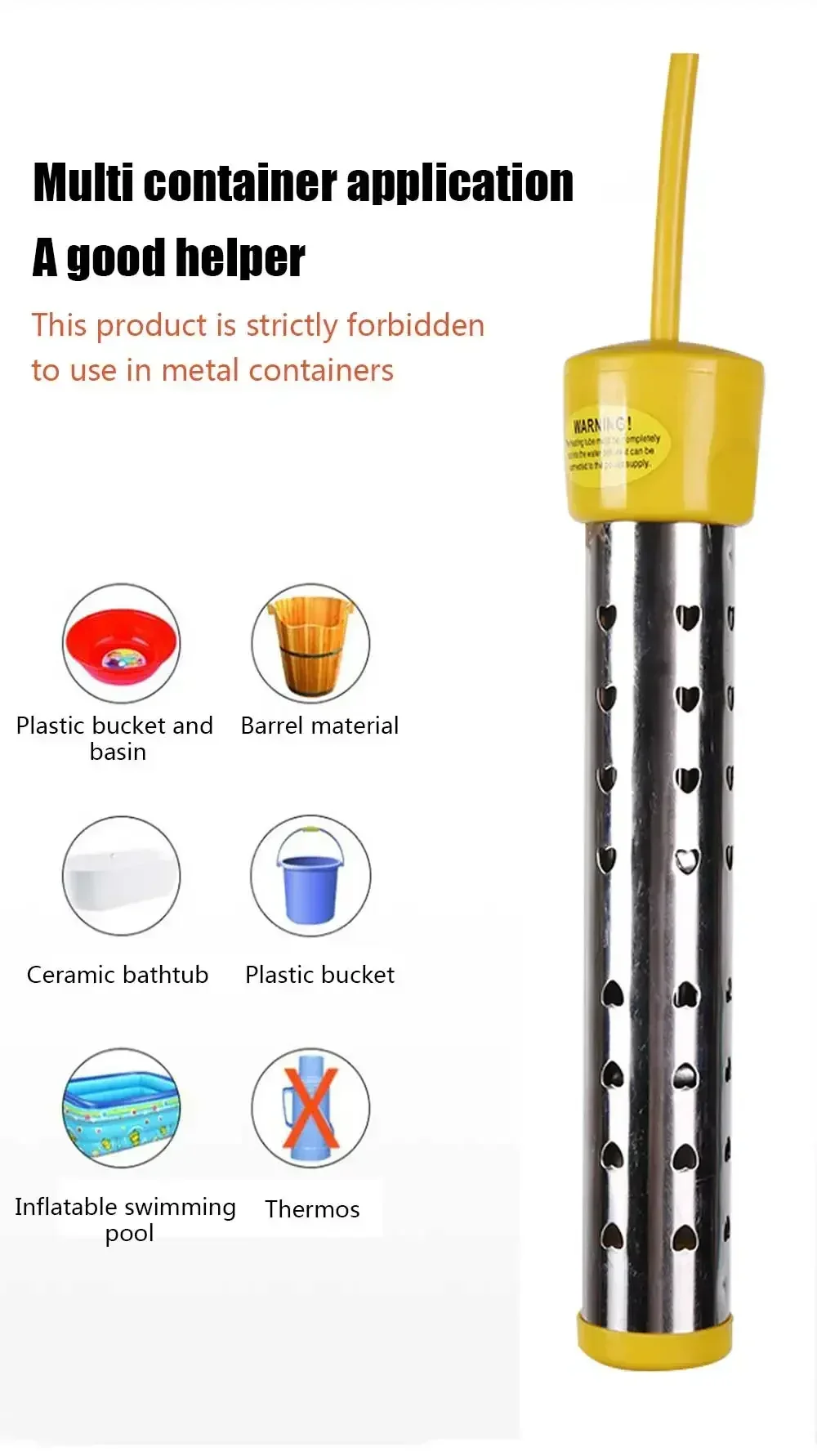 [Faster hot water]: 2000W high-power immersion water heater can quickly heat water without wasting too much electricity. In the cold winter, you no longer have to wait a long time to get warm water. When you use an immersion water heater, you can enjoy hot water anytime, anywhere in just a few minutes. [Safety protection] This immersed electric water heater has 304 stainless steel protection. Heating in water for a long time will not rust, and it can also prevent heating from direct contact with people, effectively preventing burns. Equipped with a water thermometer, when the temperature reaches the requirement, the water can be stopped in time. [Quality material]: The power cord plug has passed UL certification. It is safer than assembling wires and plugs. Simply plug it into any grounded wall outlet. The travel heater continuously heats the water to the most suitable temperature. [Easy to use] Just put the complete immersion pool heater in the water. Please note that the heater must be completely immersed in water during use. With water temperature measurement, you can base on temperature. Note: It is recommended that the continuous use of the tap water heater should not exceed 3 hours. [Portable and multifunctional]: You can use the pool heater anywhere. It supports use in containers of different sizes, such as buckets, basins, bathtubs, mini inflatable portable swimming pools, etc. This is the first choice for home and outdoor work. When the temperature is higher than 158 degrees Fahrenheit, it will automatically cut off the power connection. Package contains: 1pcxHeater