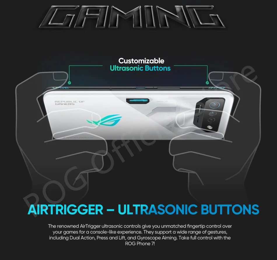 The renowned AirTrigger ultrasonic controls give you unmatched fingertip control over your games for a console-like experience. They support a wide range of gestures, including Dual Action, Press and Lift, and Gyroscope Aiming. Take full control with the ROG Phone 7!