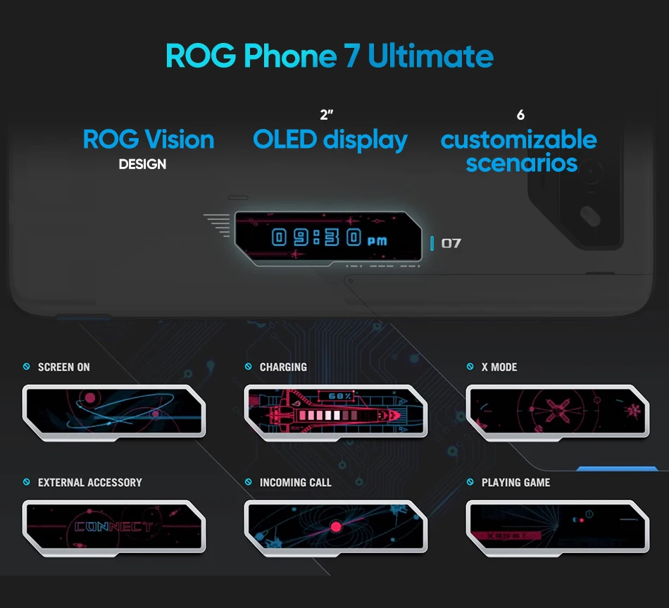 ROG Vision is a unique matrix color display on the rear of the phone that exemplifies the daring innovation behind the ROG brand.