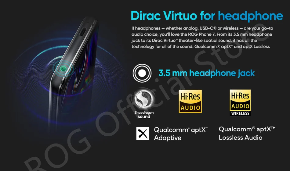 Qualcomm® aptX™ and aptX Lossless support ensure super-low-latency high-fidelity Bluetooth audio, so whatever your listening choice, your ears will thank you for the ROG Phone 7.