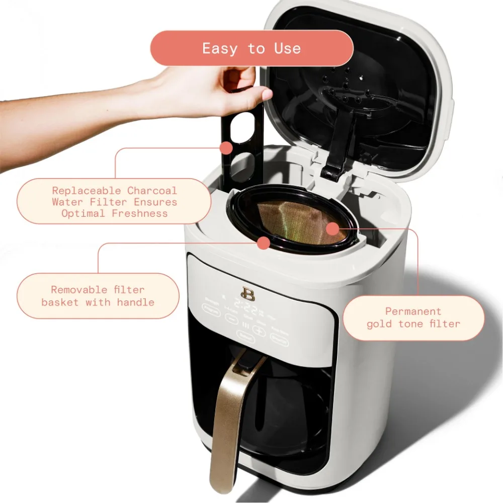 - Includes Reusable Gold Filter Basket, Charcoal Water Filter, And Measuring Scoop.
