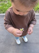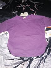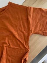 A wonderful thin light T-shirt for summer! We are 82 cm, we are 1,5 years old, 100 oversized size is good. The neck is really wide for me, but for 30 degrees on the street is the very thing!