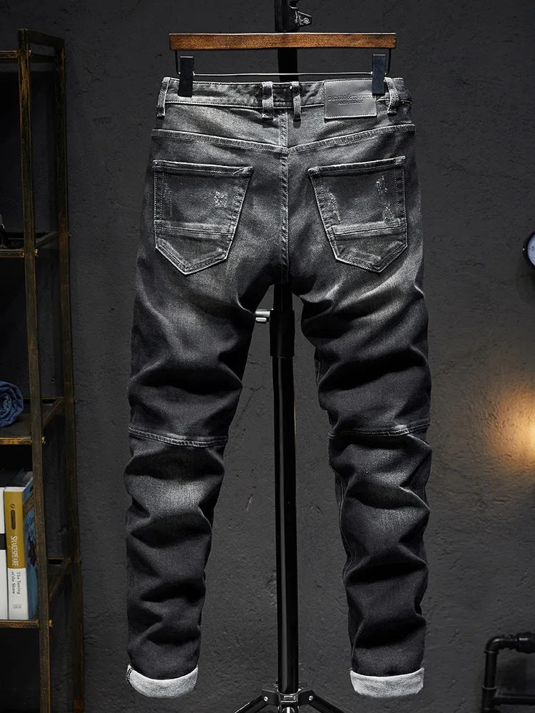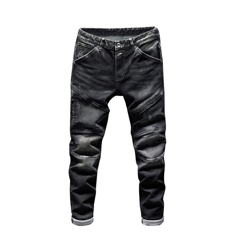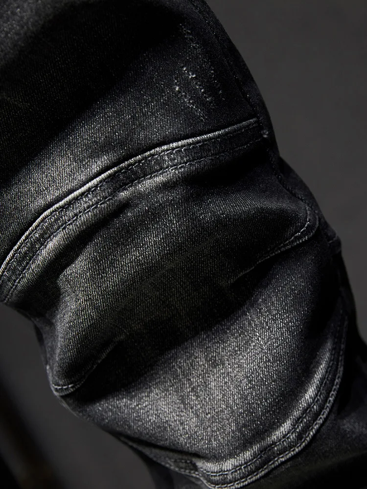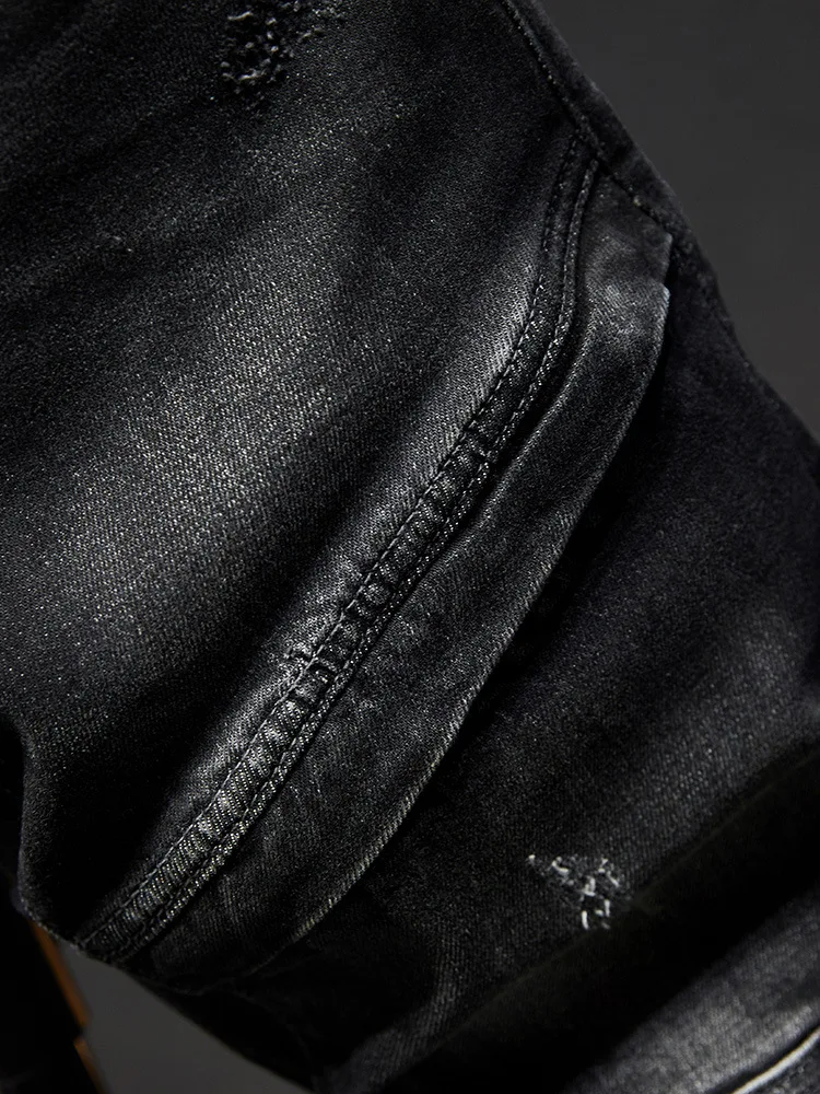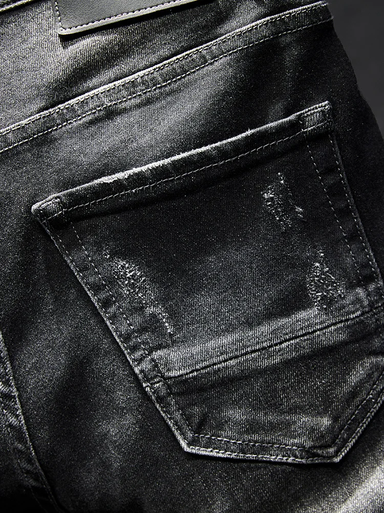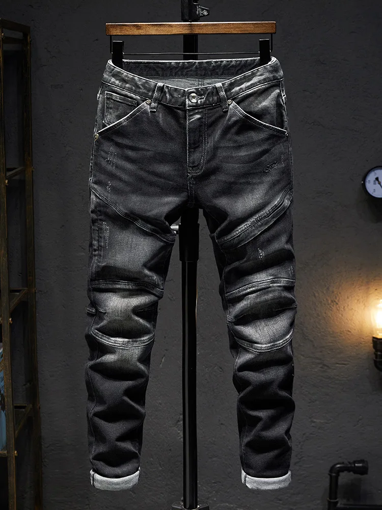 2024Autumn Men’s Black Jeans High Quality American Zipper Stitching Stretch Slim Street Fashion Haulage Motor Trousers