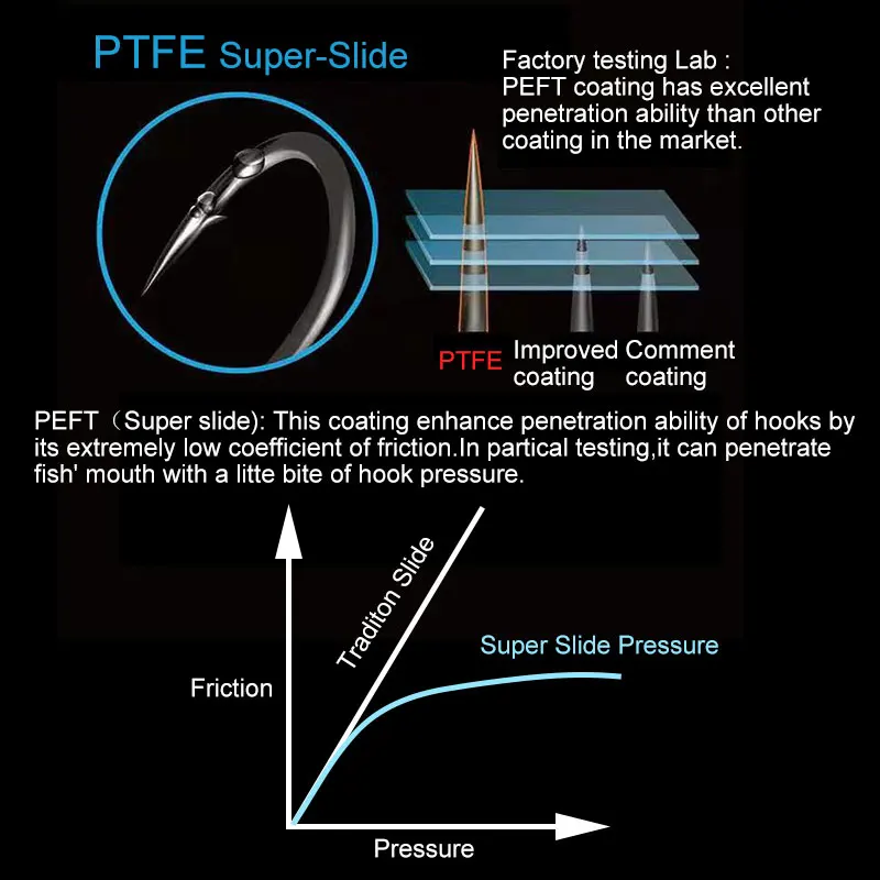 PTFE coating, micro barb, cured shank, wide gap, forged shank
