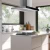 Sleek, stainless steel range hood featuring a black glass control panel.