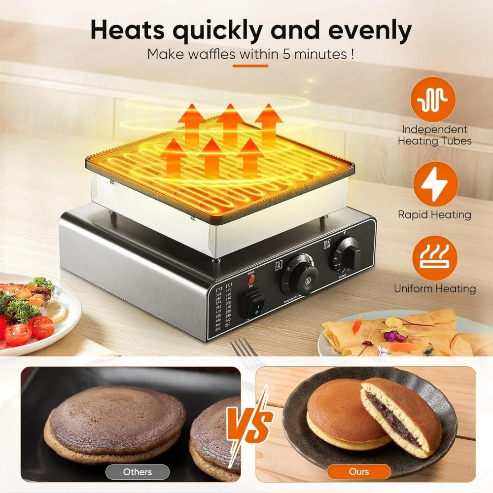 - 【Heavy-Duty Material】This commercial pancake maker machine adopts a high quality food-grade stainless steel body, and a non-stick PTFE material, and the surface is coated with non-stick coating, which is easy to demould, durable, corrosion-resistant, high-temperature resistant, and has a longer life.It can provide you and your family with a hot and delicious breakfast for a long time.