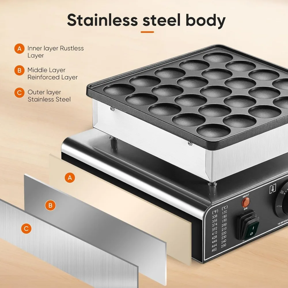 - 【High Efficiency & Fast Heating】Mini pancakes maker is designed with an annular shaped heating tube inside, with uniform heat distribution and a temperature range of about (122-572℉ / 50-300℃) . preheating process 5-10 minutes. the temperature will be effectively increased for after preheating. In just 3-5 minutes, The cooking panel can produce 25 mini pancakes at a time, with a single hole diameter of 4.5cm (9/5in)