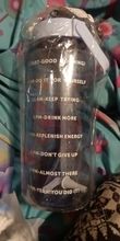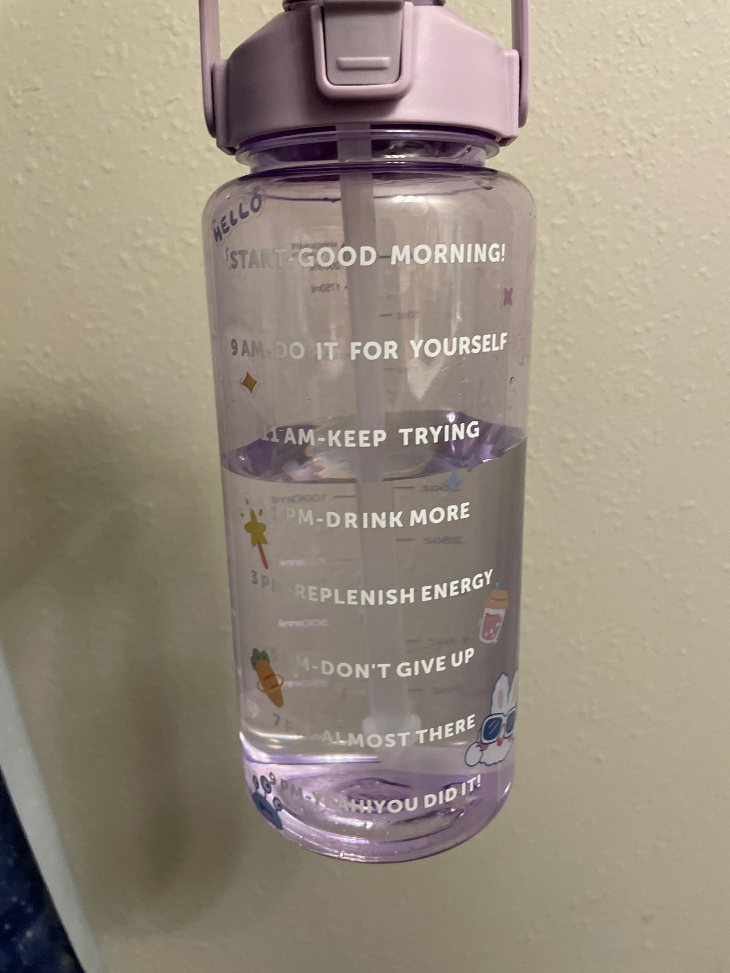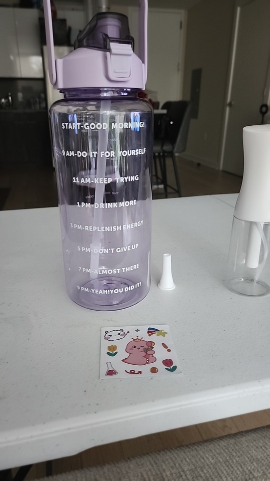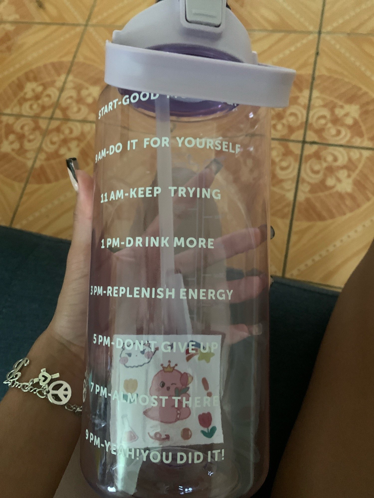 So cute! The front has time and few motivation words while the back has the amount of water in both ml and oz. It also had some cute stickers!