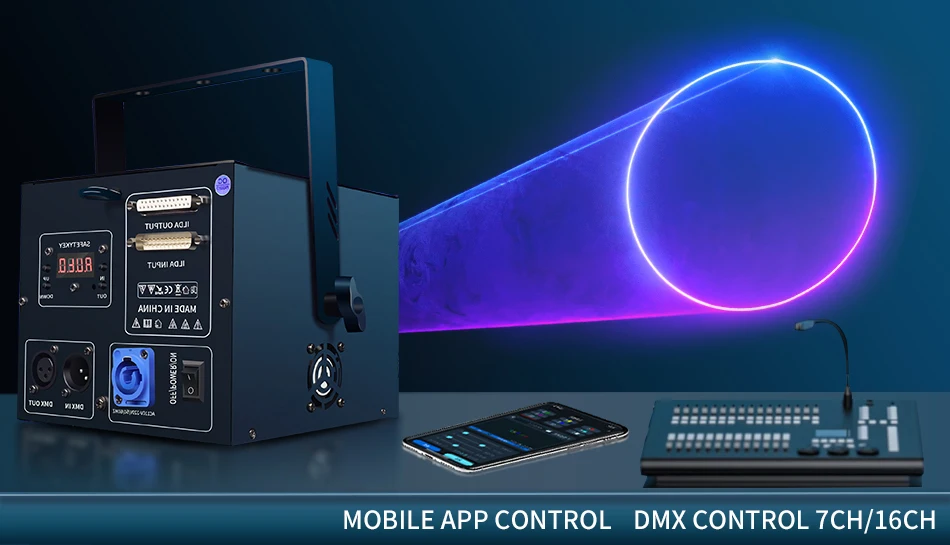 Control modes: sound control, auto-run, DMX 14/19 channels, master/slave mode, ILDA software control
