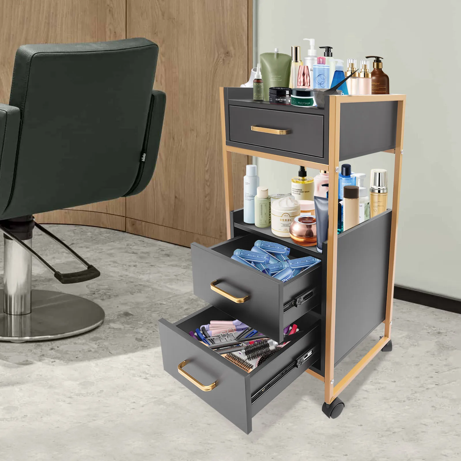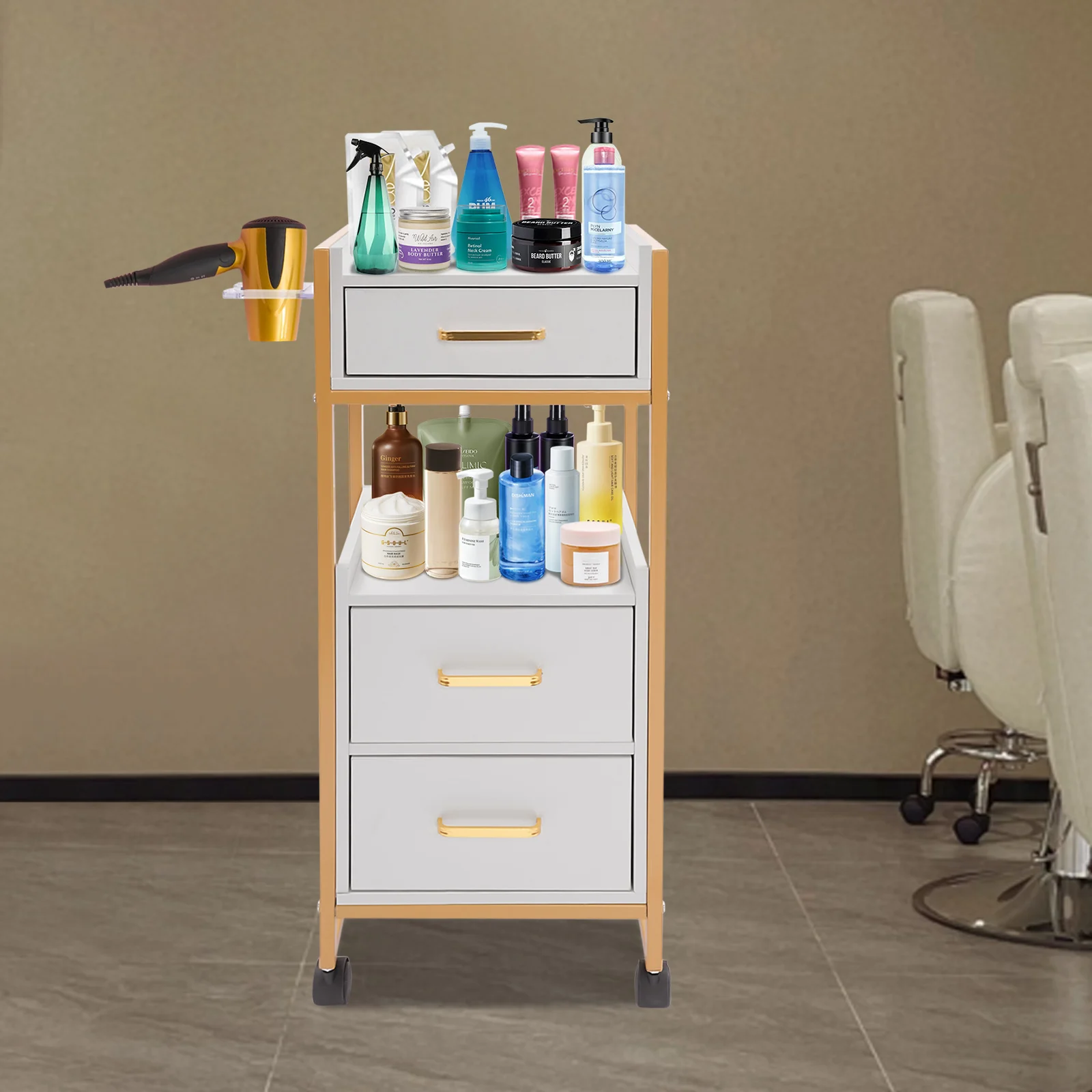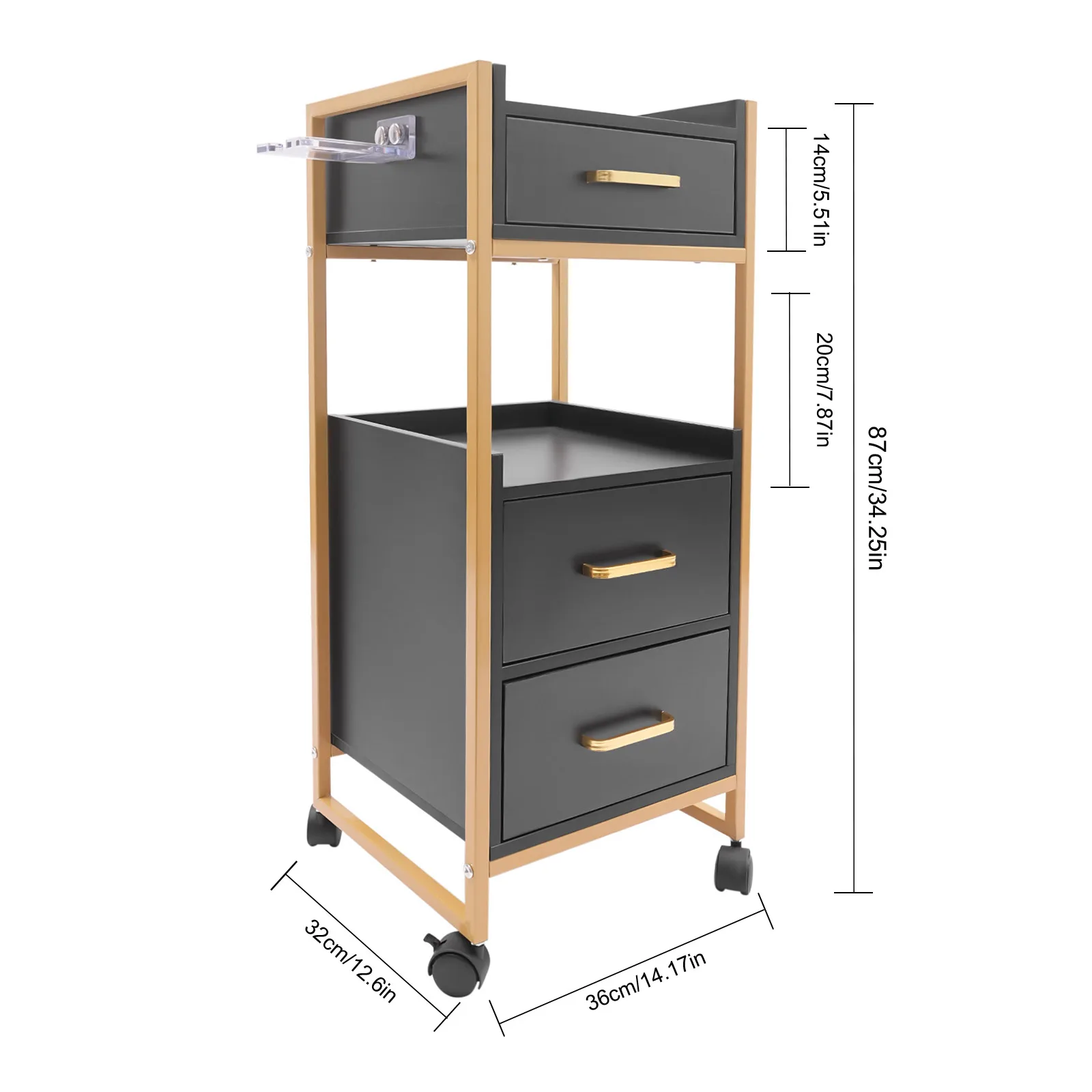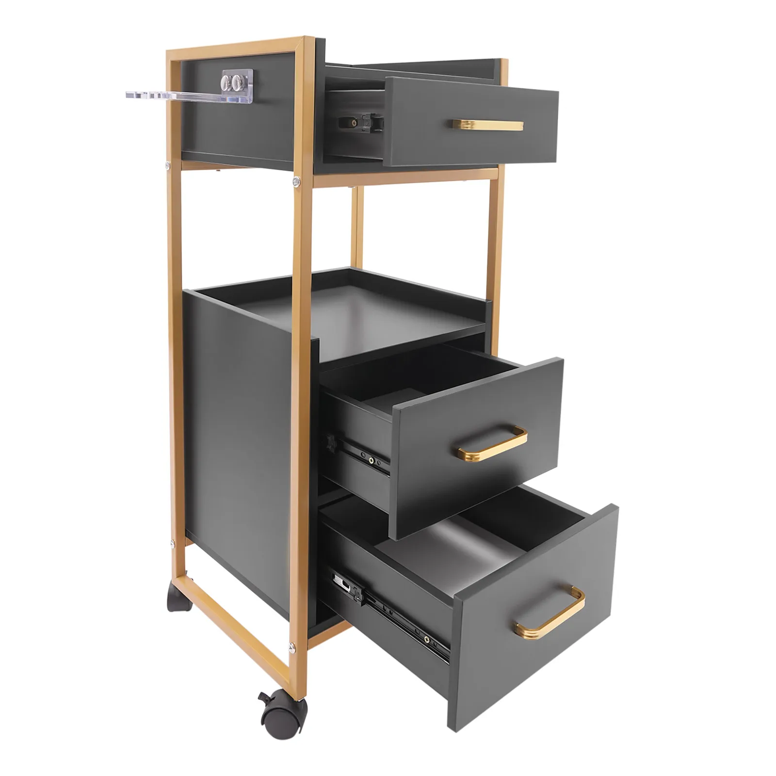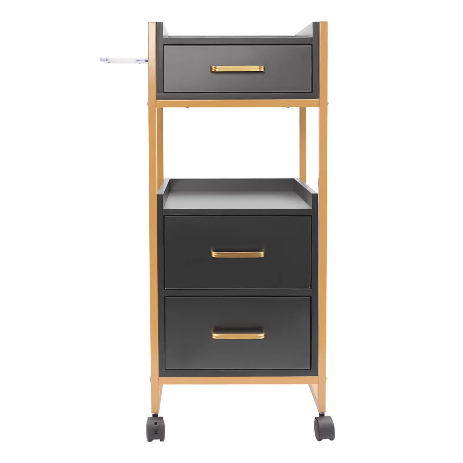 With its attractive appearance, large capacity, and sturdy construction, this hair salon storage cart is the ideal storage solution for your barber shop. Its 3 drawers and two open tiers are ample enough to store daily barber tools, and the four casters make this product easy to move around, making your work environment tidy and increasing your work efficiency.