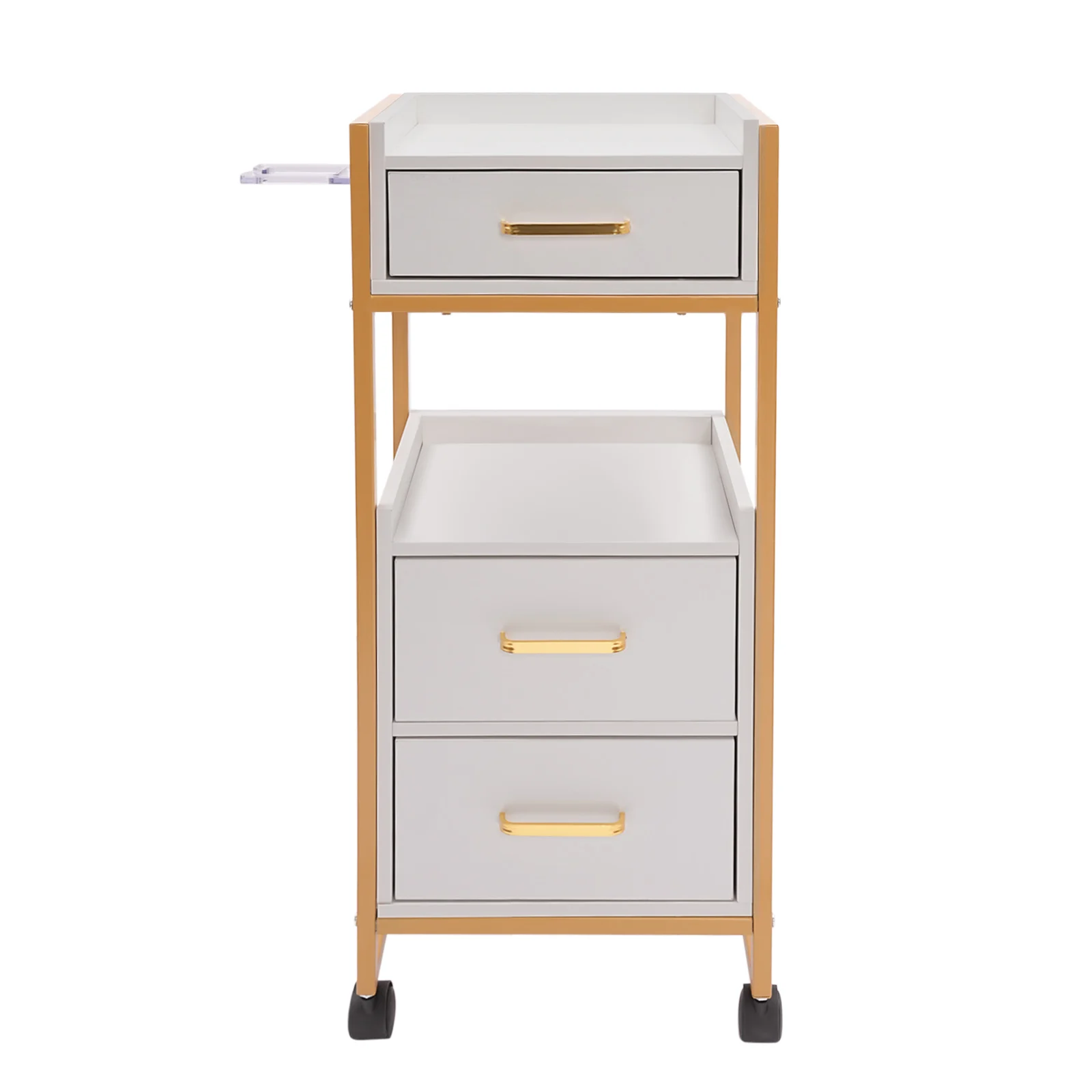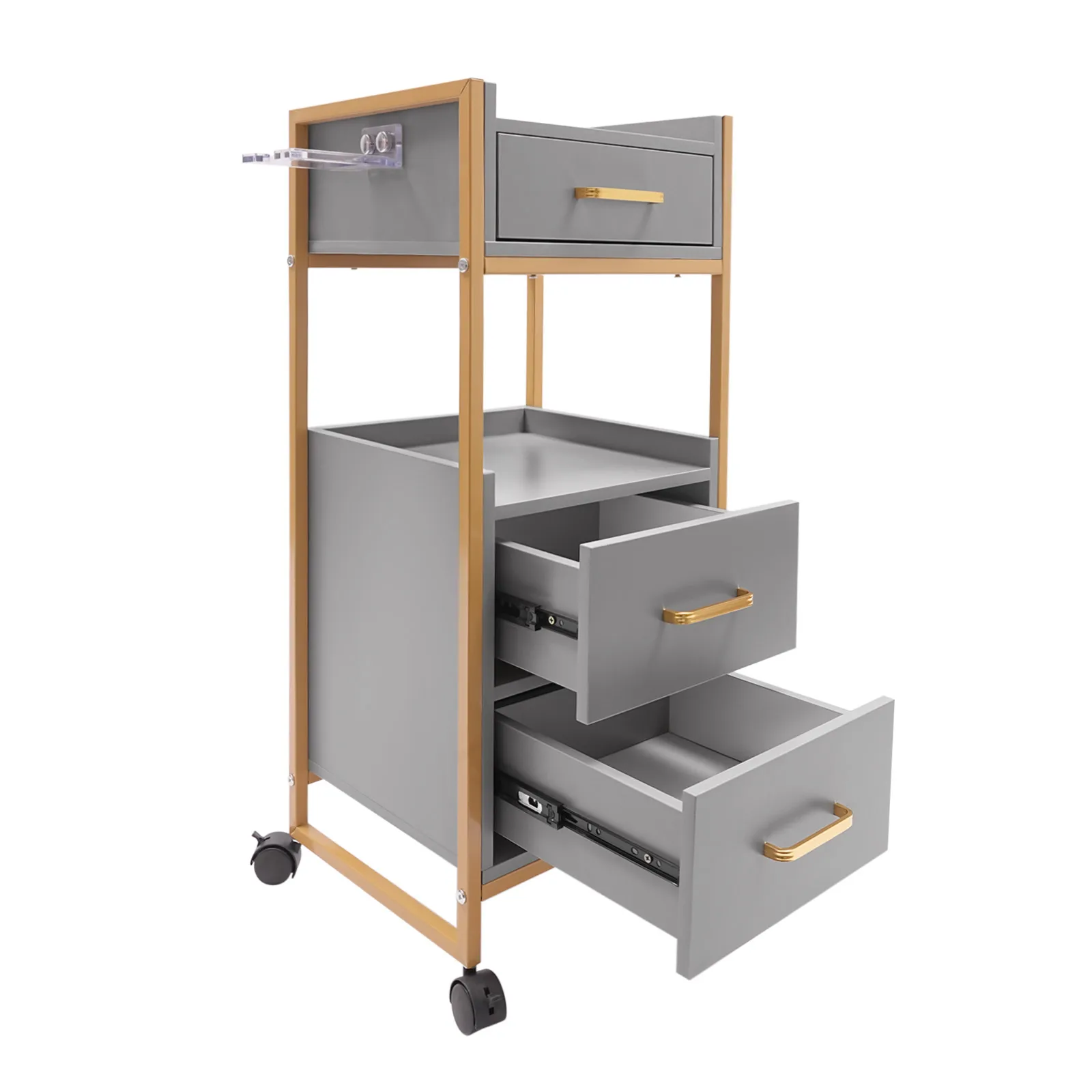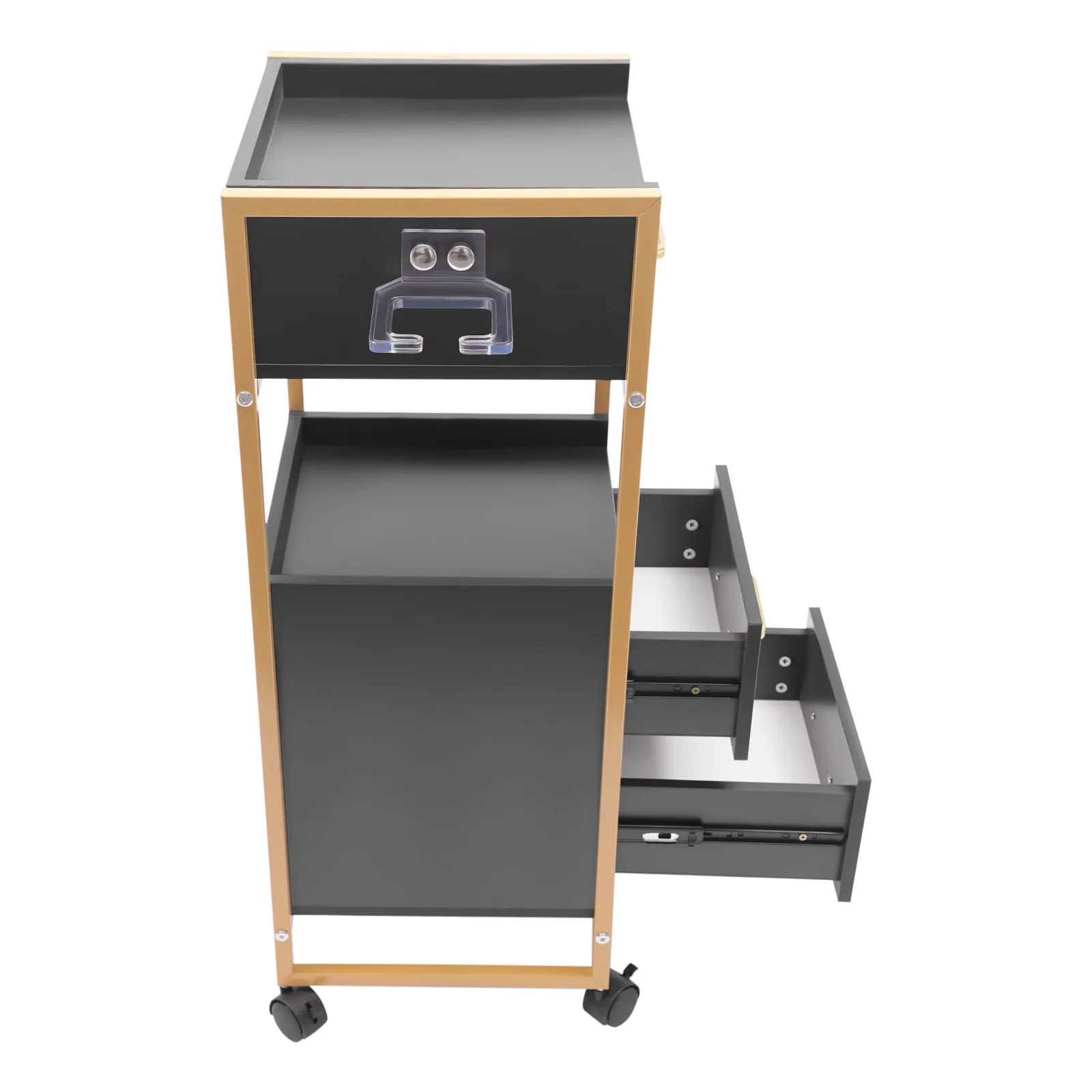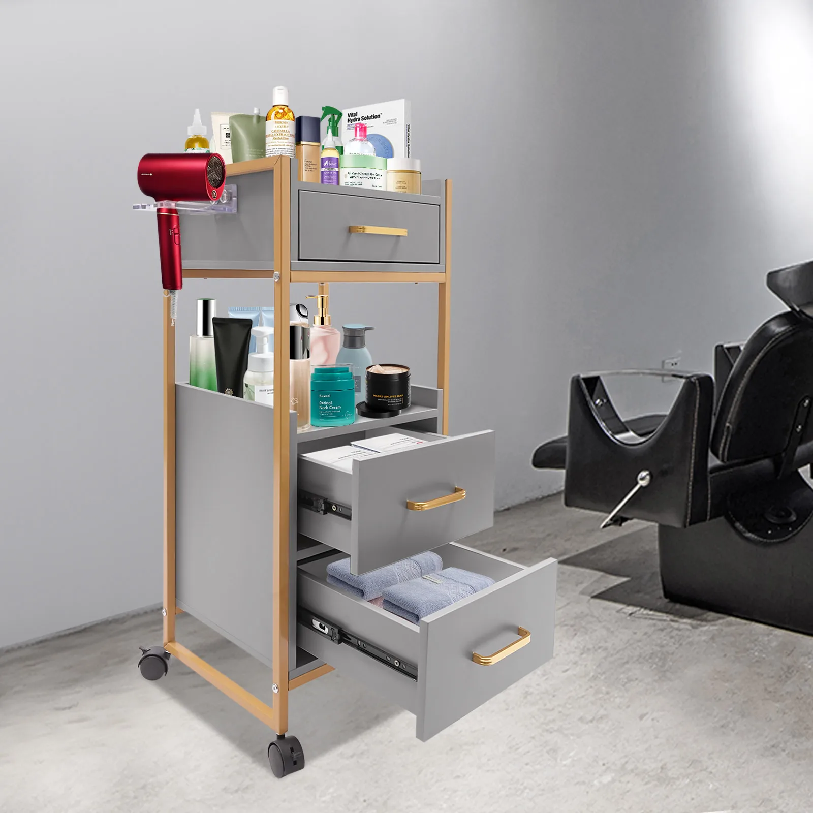 With its attractive appearance, large capacity, and sturdy construction, this hair salon storage cart is the ideal storage solution for your barber shop. Its 3 drawers and two open tiers are ample enough to store daily barber tools, and the four casters make this product easy to move around, making your work environment tidy and increasing your work efficiency.