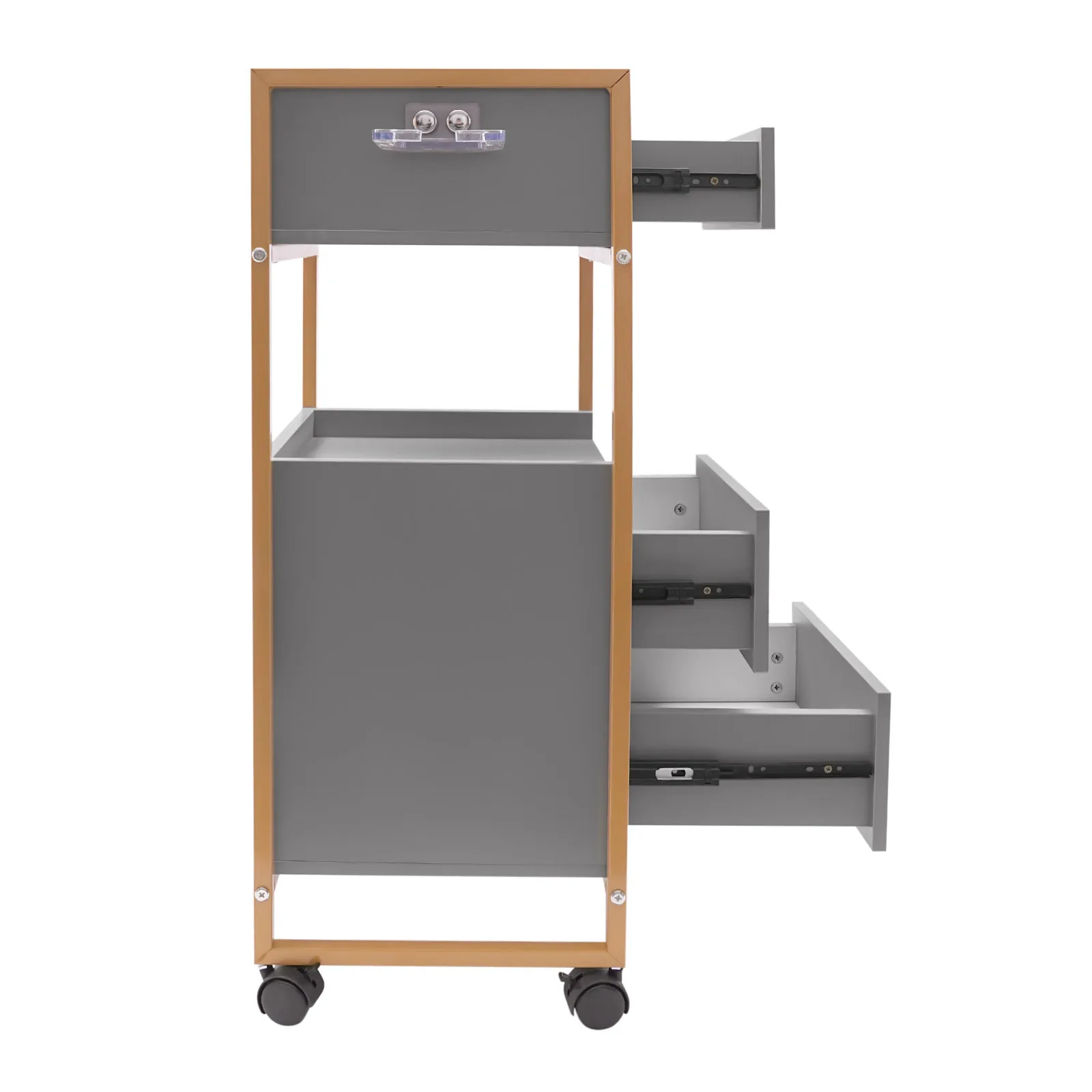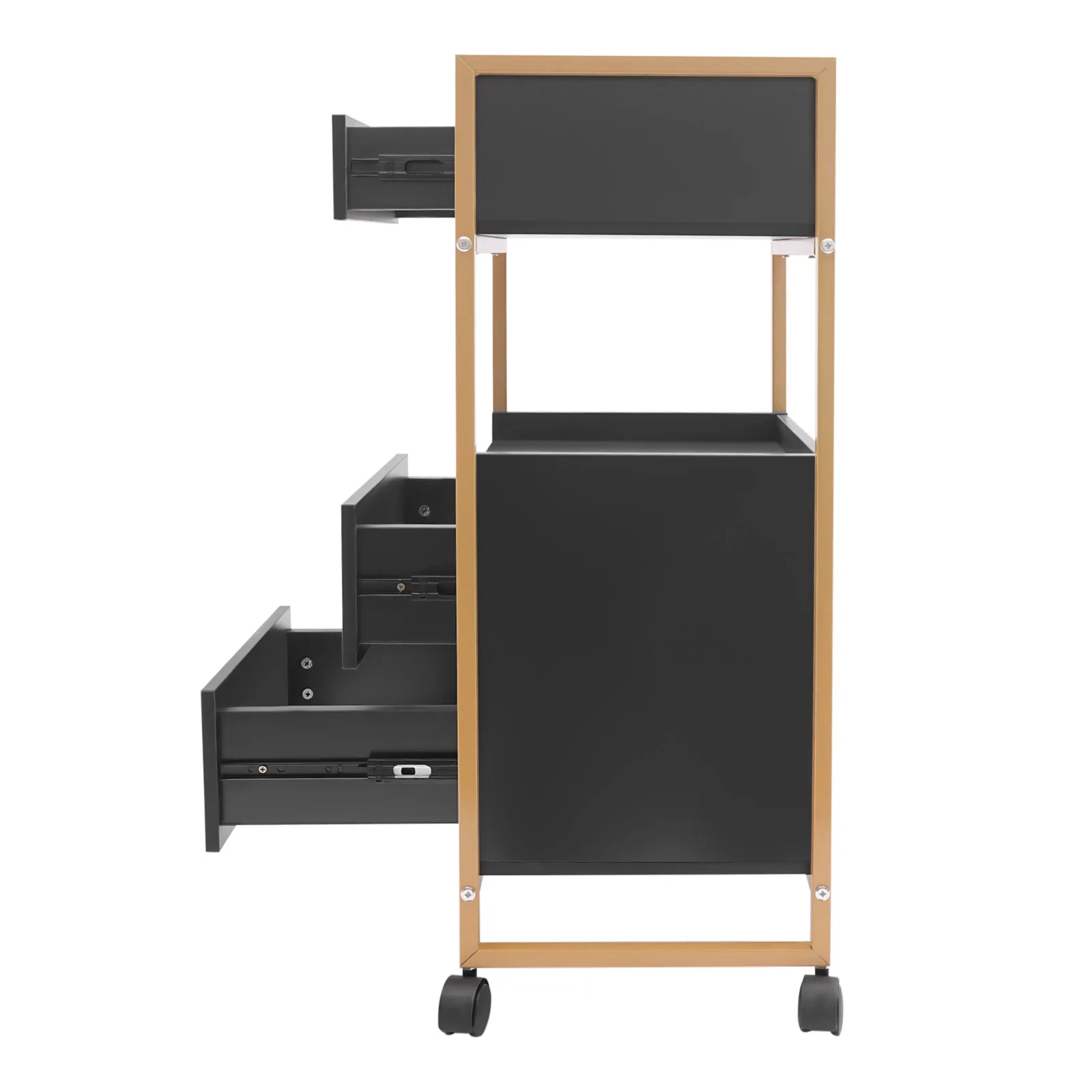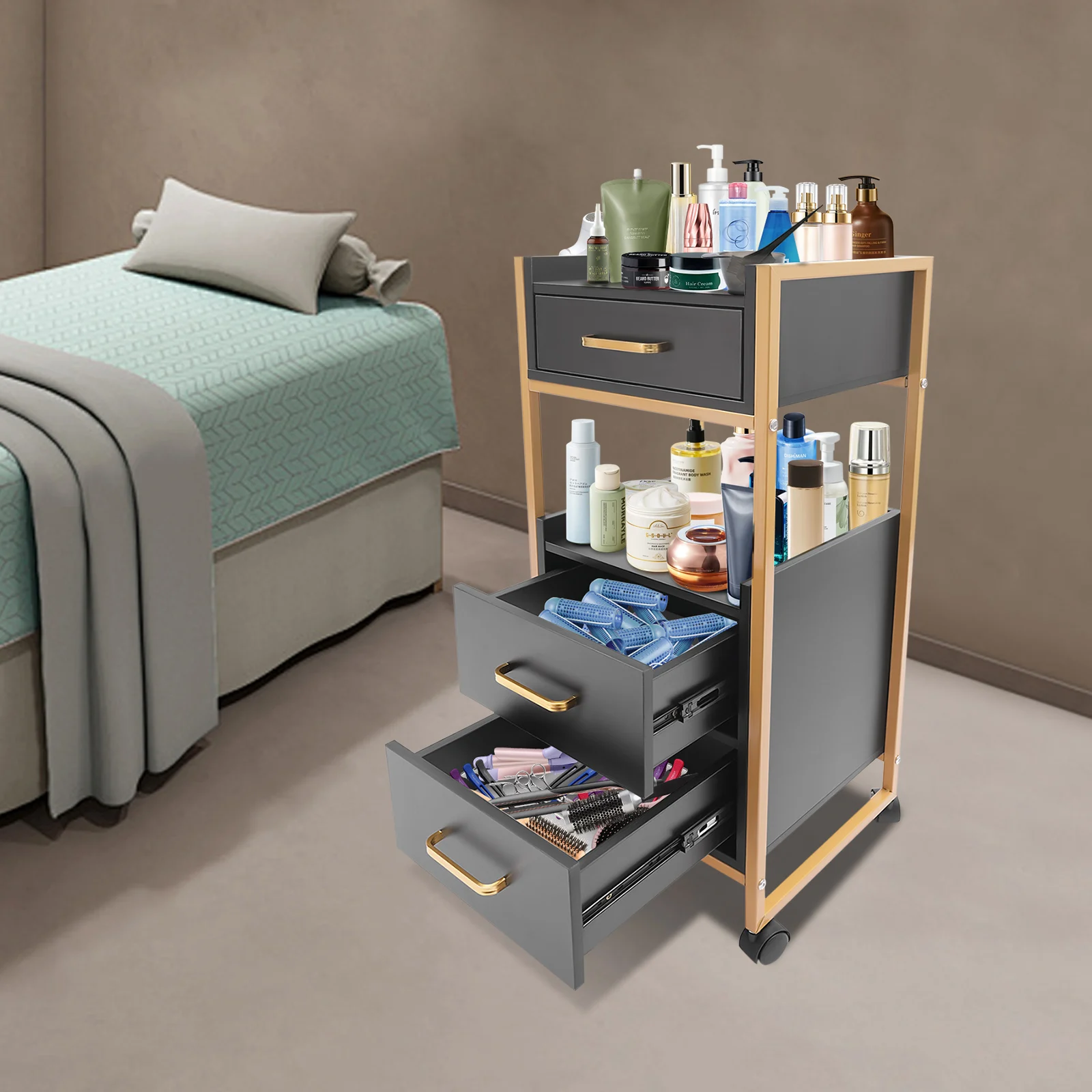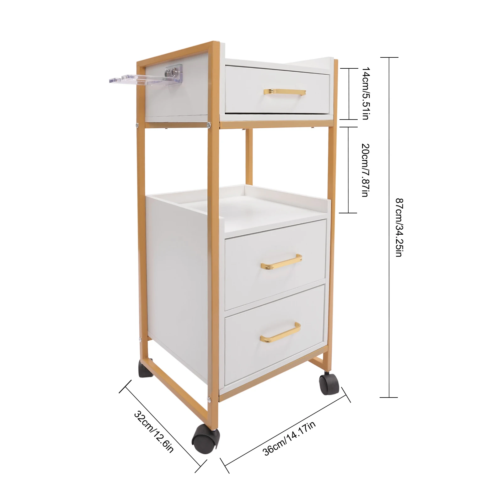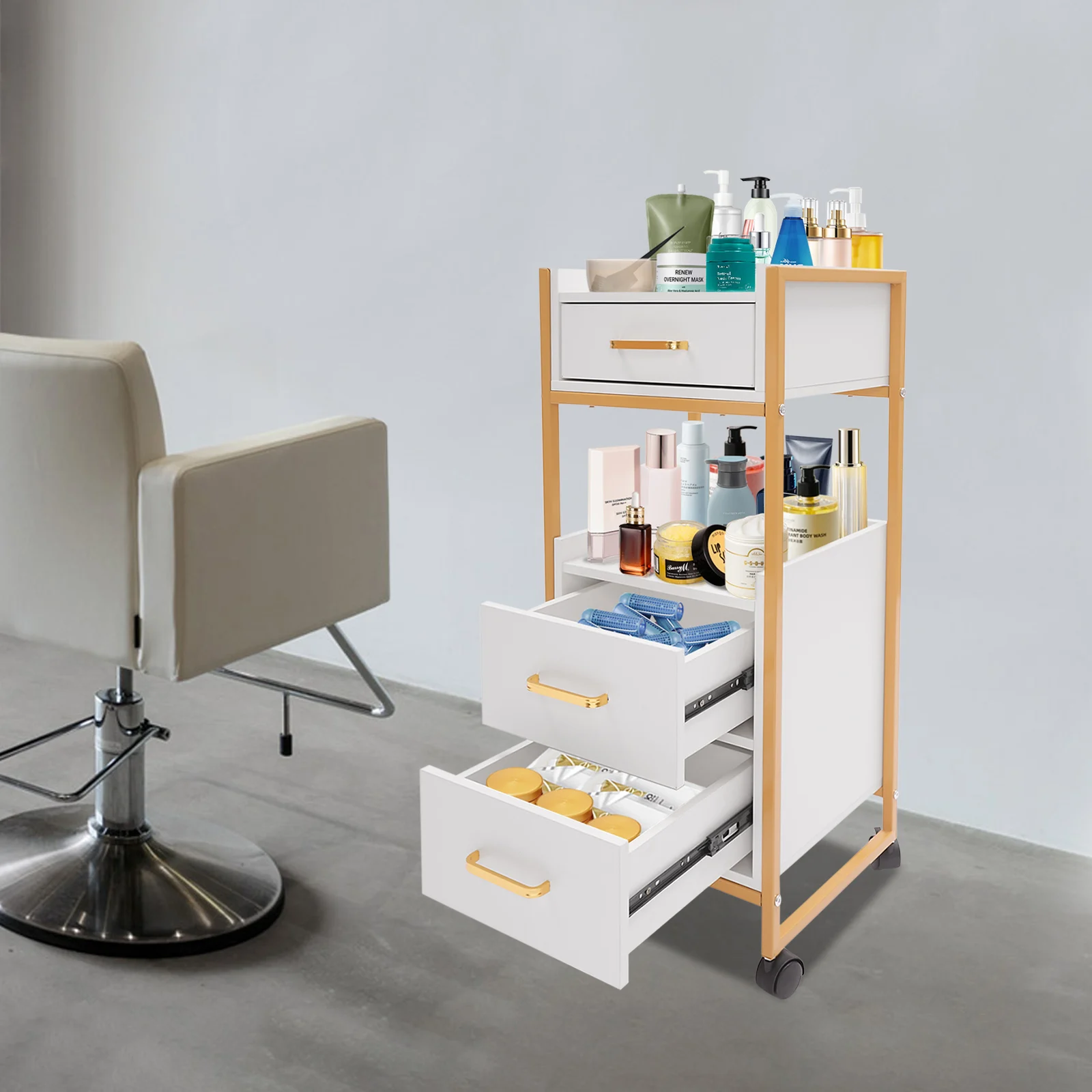 With its attractive appearance, large capacity, and sturdy construction, this hair salon storage cart is the ideal storage solution for your barber shop. Its 3 drawers and two open tiers are ample enough to store daily barber tools, and the four casters make this product easy to move around, making your work environment tidy and increasing your work efficiency.