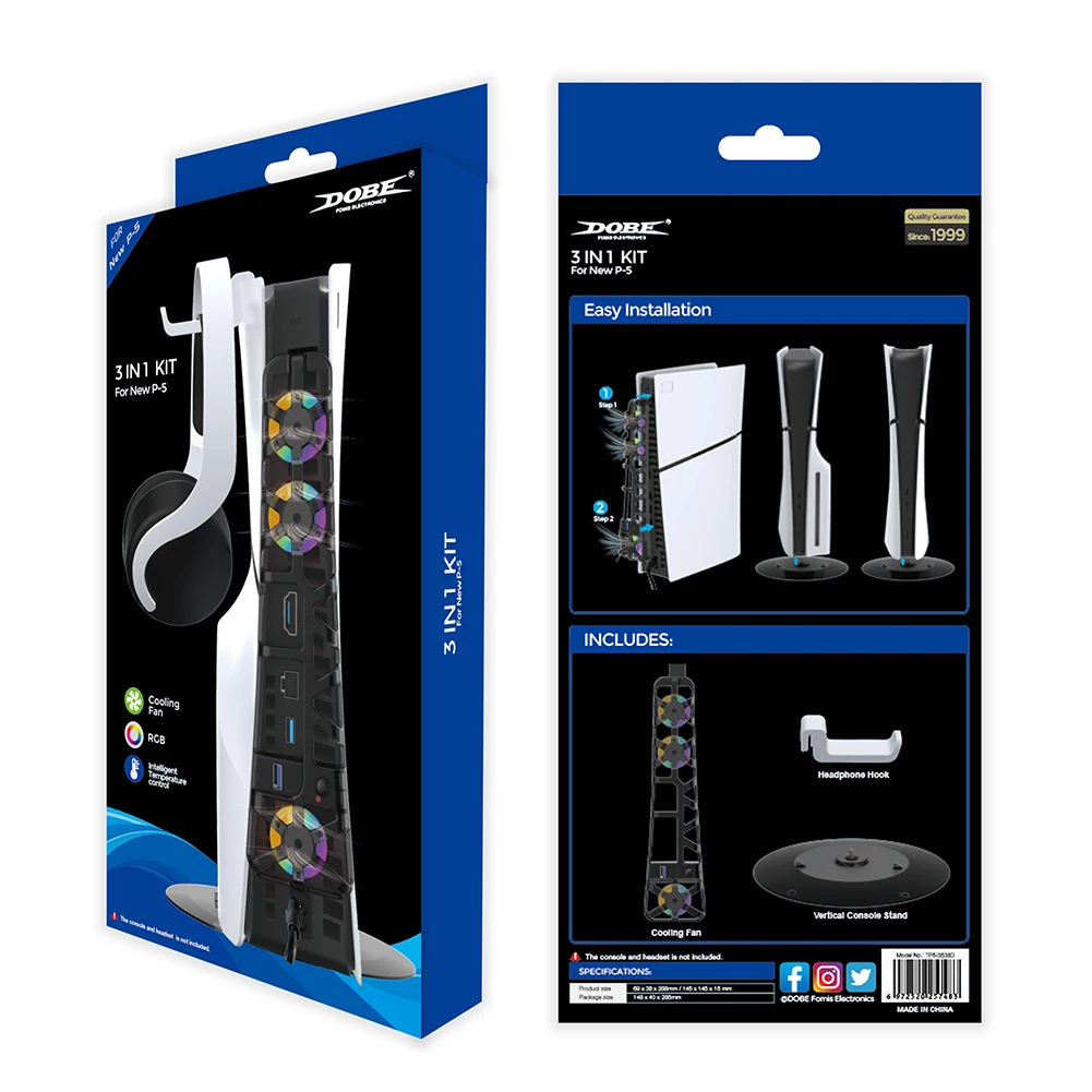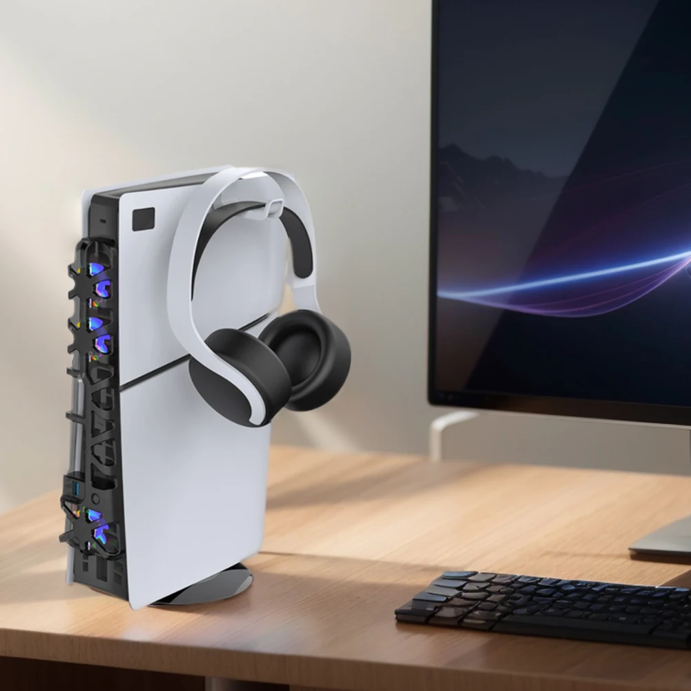 Feature: 1. Designed for PS5 Slim: This cooling fan, vertical stand, and headphone hook set is specifically engineered for the PS5 Slim gaming console, making it an ideal choice for gaming enthusiasts. It combines cooling, support, and storage functionalities to enhance your gaming experience, offering comfort and convenience. 2. Efficient Cooling System: With a design that addresses the cooling needs of the console, the high-efficiency fan output effectively reduces the console’s temperature, preventing overheating. The vertical stand features a stable structure that securely positions your console on any desk, minimizing the risk of accidental bumps. Additionally, anti-slip pads at the base ensure the console remains steady. 3. Convenient Headphone Hook: The cleverly designed headphone hook on the side of the stand allows you to hang your headphones within reach, avoiding cable clutter. This feature helps maintain a tidy and organized gaming space, even during immersive gaming sessions. 4. Enhances Gaming Experience: Not only does this cooling fan, vertical stand, and headphone hook set improve the comfort of your gaming sessions, but it also reflects the player’s taste and personality. It serves as a reliable assistant on your gaming journey, enriching your gaming life with its practicality and style. 5. Durable and Easy to Assemble: Made from ABS material, this set is durable, easy to assemble, and requires no complex tools. You can set up a stable and secure console environment in just a few minutes, ensuring your gaming setup is both efficient and aesthetically pleasing.