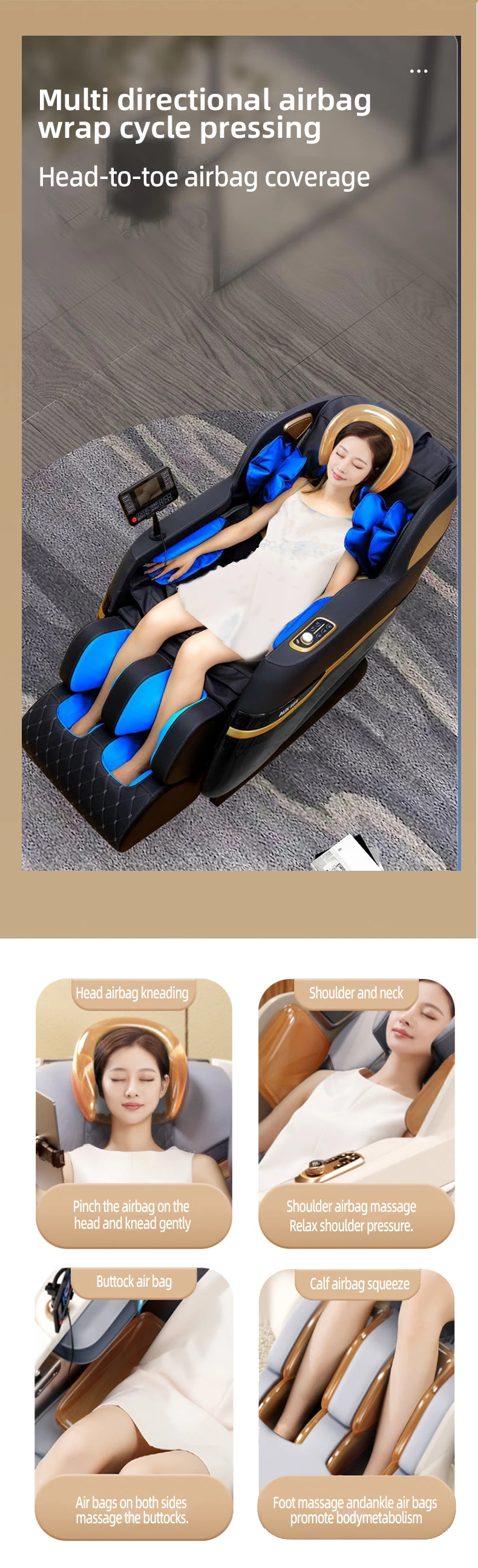 Leg airbag and foot roller massage can relieve your day’s fatigue and restore your vitality.