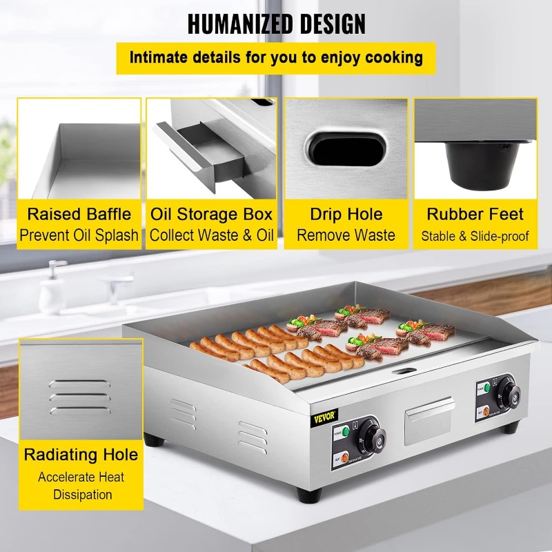 【WIDE APPLICATION】-The electric flat top grill can be used in family or commercial places, such as restaurants, shops, roadside stalls, and snack bars; It is very suitable for processing pancakes, crispy bacon, roast cheese, rich breakfast, fried dishes, omelets, pizza, steak, and hamburgers.NOTE:This product is overpowered and more suitable for commercial use than home use.