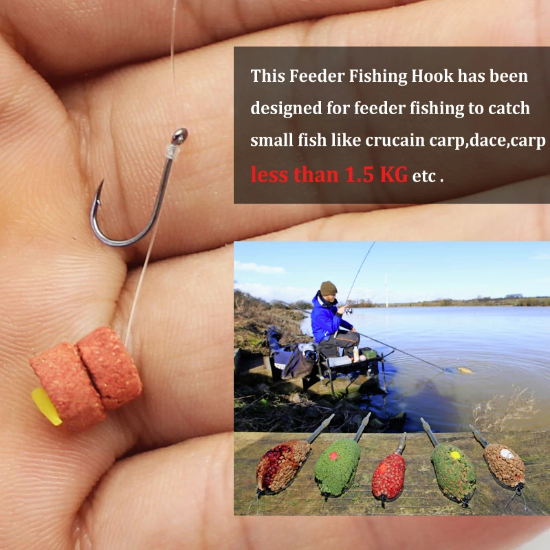 This Feeder Fishing hook has been designed for feeder fishing to catch small fish like crucain carp,dace , carp less than 1.5 KG etc .The design of light weight ,right bent hook point and circle hook concept will increase most of possiblity to hook fish.