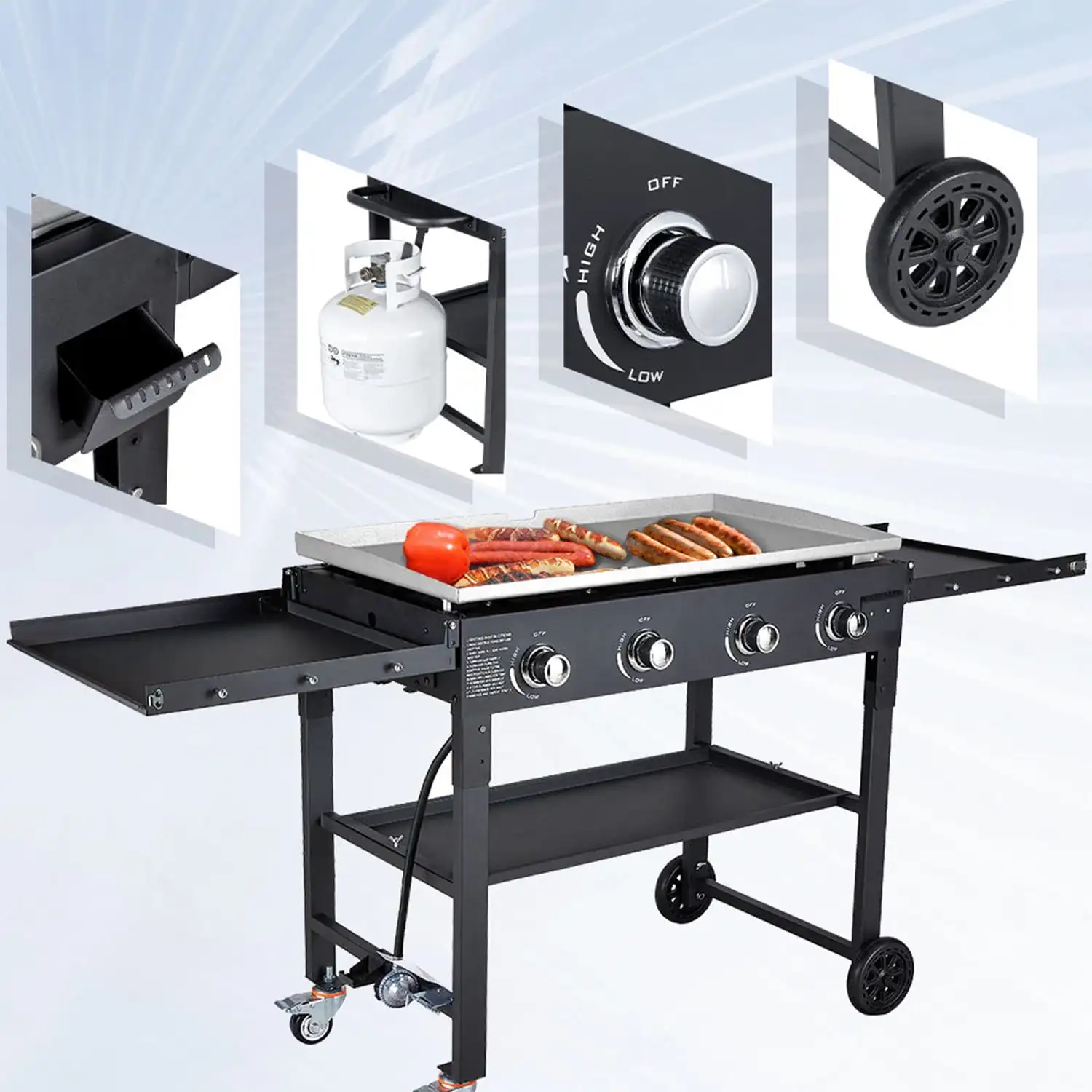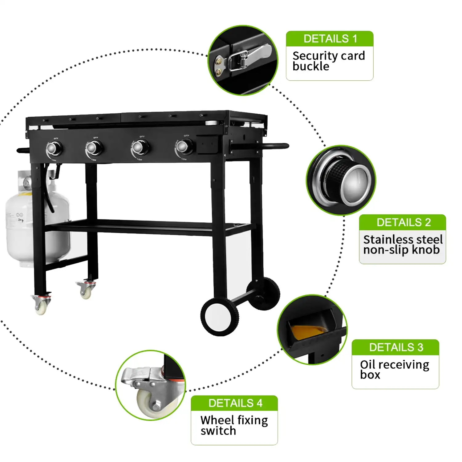 This family-friendly portable gas grill is a must-have for any BBQ enthusiast. Boasting 60,000 BTUs, it heats up quickly and efficiently, with four control knobs to adjust the temperature of each of the four individual burners. The handle design makes it easy to put on and take off the griddle plate, while the waste oil cup collects waste oil and the grease catch pan prevents oil from dropping. The cylinder holder base provides a secure place for your gas cylinder, and its versatile cooking capabilities allow you to cook a range of foods including eggs, pancakes, bacon, steak, and potatoes. It’s ideal for use on your patio, in your garden, or in your backyard. Assembly is made easy with the clear instructions provided, and the smooth surface ensures effortless cleaning. Don’t hesitate to order this Portable Gas Grill today!