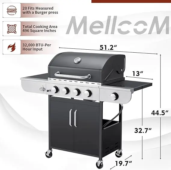 - Easy to Assemble: With dimensions of 51.2 in L x 19.7 in D x 44.5 in H, this propane gas grill is designed for easy installation, saving time and effort. Customer service is available to assist with any inquiries or concerns regarding parts.