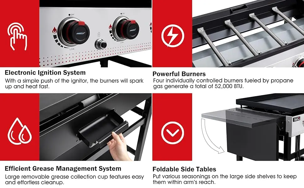 - Equipped with 784 sq. in. spacious cooking capacity and 52,000 BTU (in total) sufficient cooking power