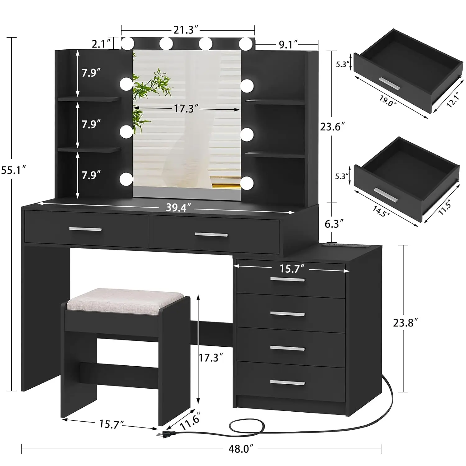 Built-in Charging Station: Having the plugs in the front makes life so much easier! This vanity table add 2 standard plug sockets and 2 USB ports, more convenient for curling iron, beauty device, hair dryer and phone charging. Nice make up vanity for dressing room, salon or live broadcast